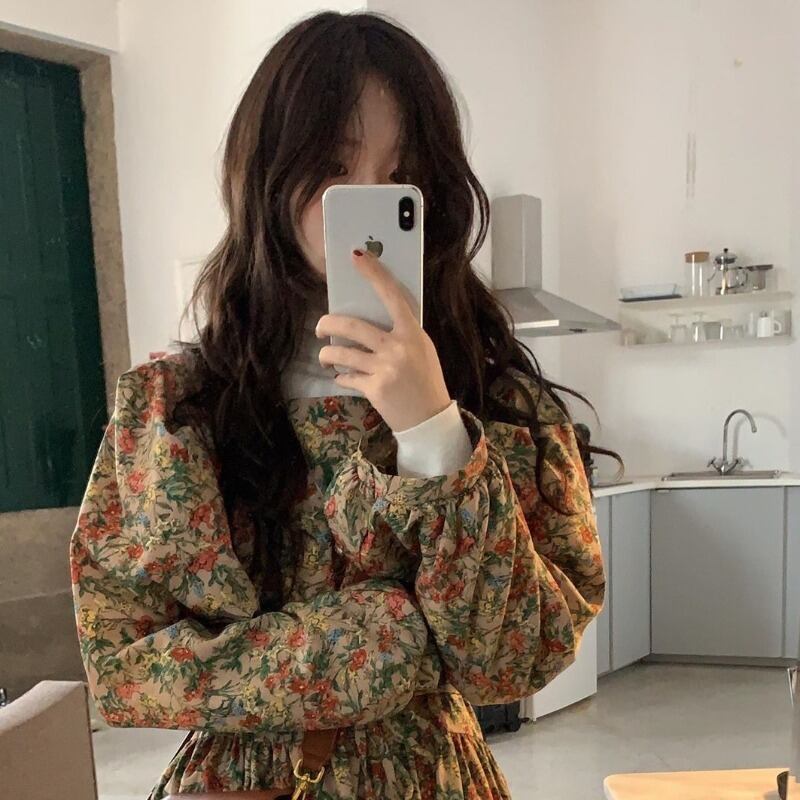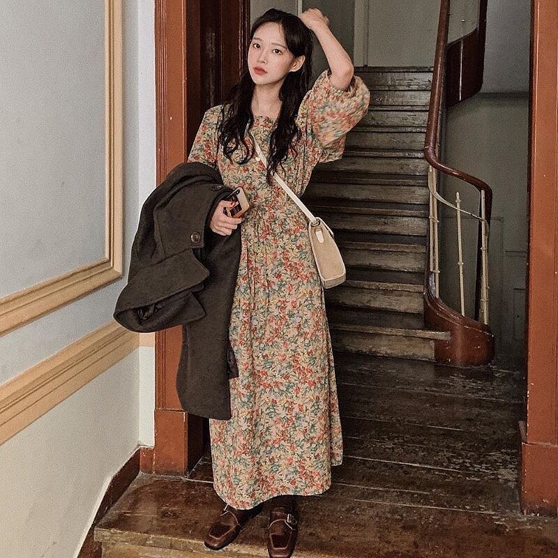 2020シックな早春の新しいレトロなウエスタンフローラルオーバーザニーロングレースアップ長袖フローラルドレス 韓国婦人69790016139