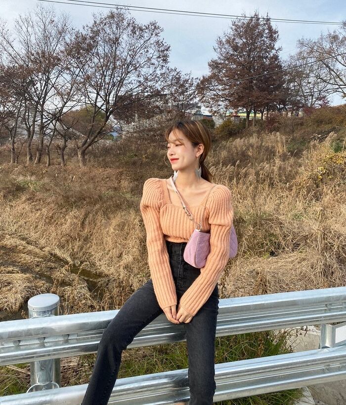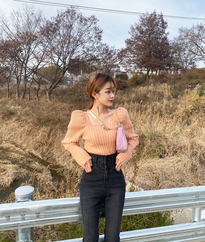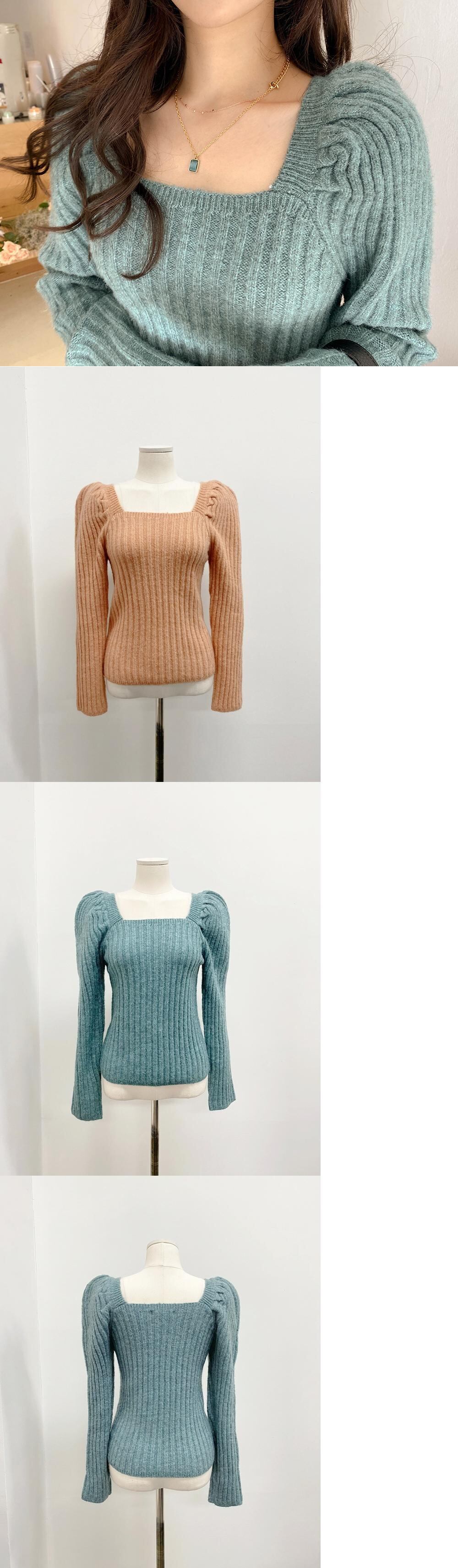 サウスシックレトロニッチスクエアネックパフスリーブスリムスリミングピットストライプトップニットセーターベースセーター女性 韓国婦人8788638284