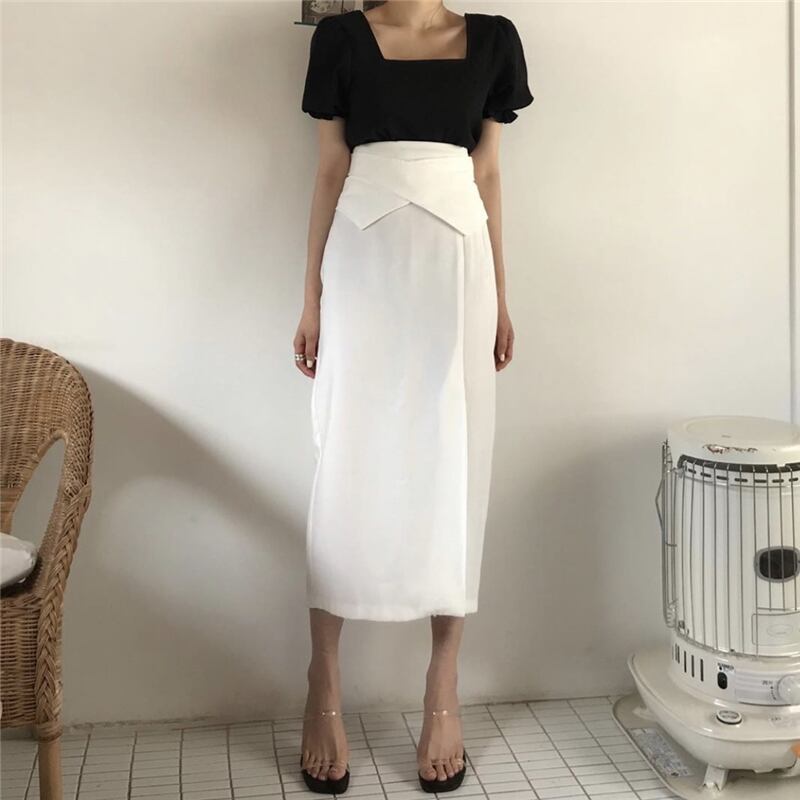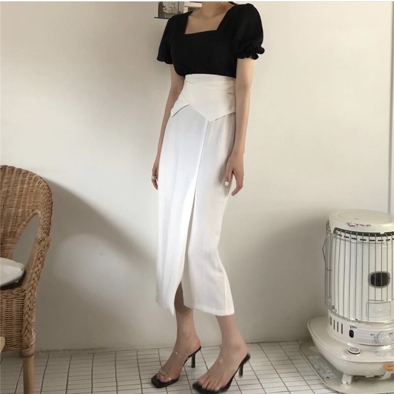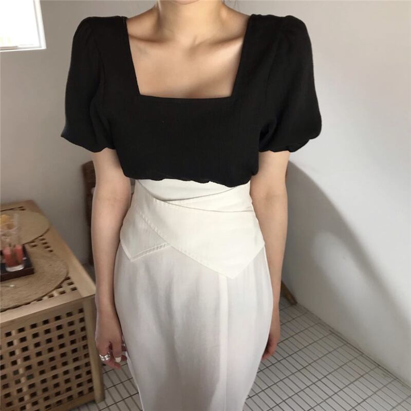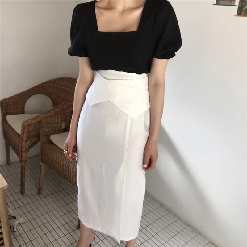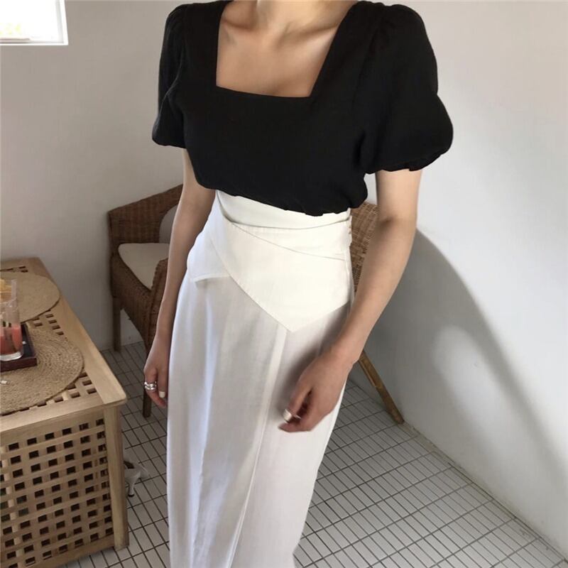 insニッチシンプルスクエアカラースリムパフスリーブシャツ+ハイウエストデザインスプリットスカートスーツ女性 韓国婦人49216646446