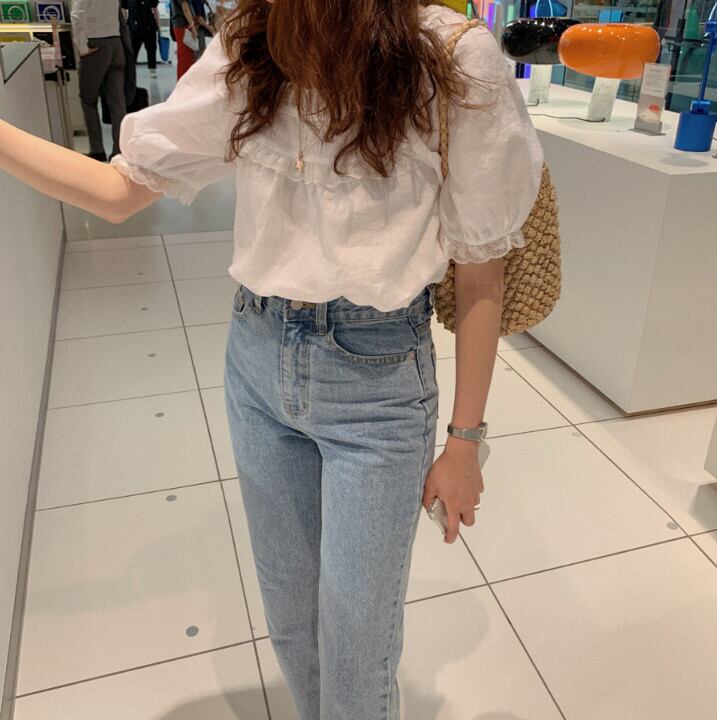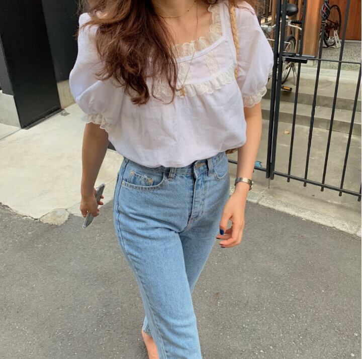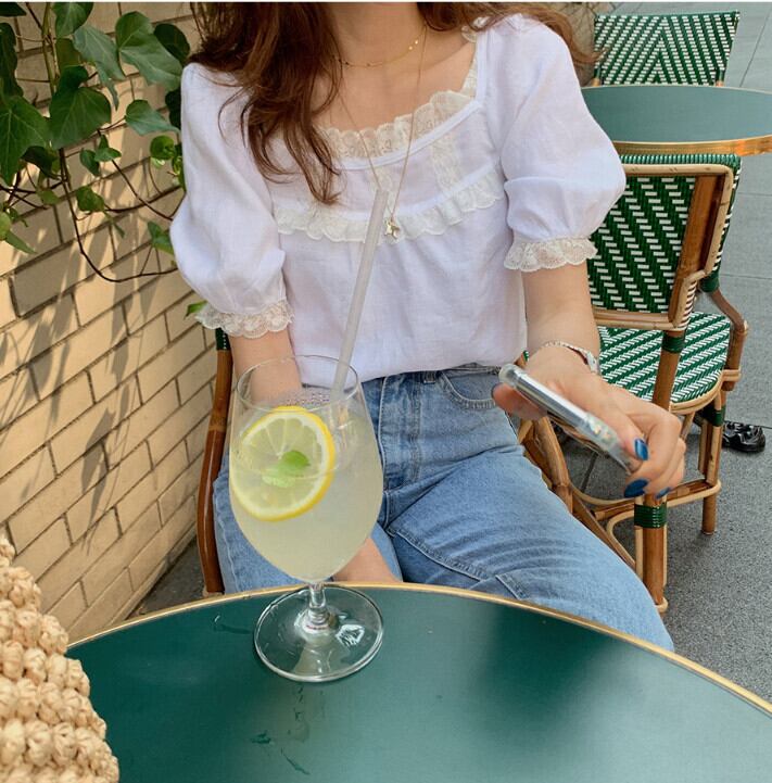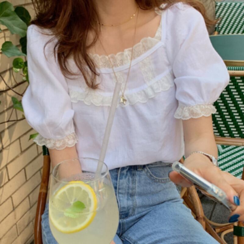 シックな年齢削減フレンチスクエアカラーレースステッチルーズ無地パフスリーブ半袖シャツトップ女性 韓国婦人25816826595