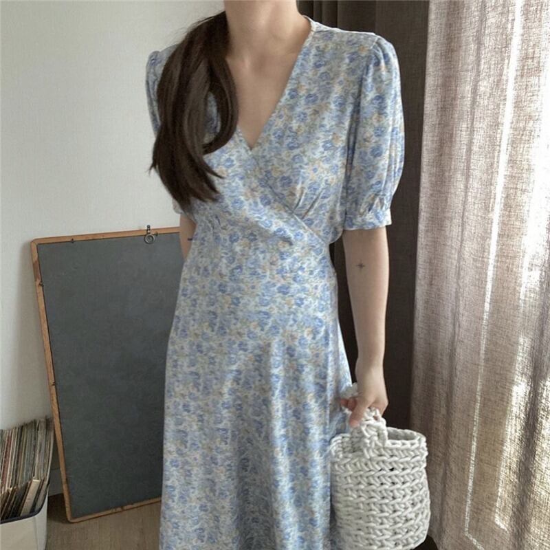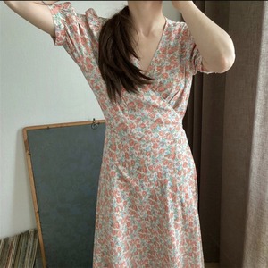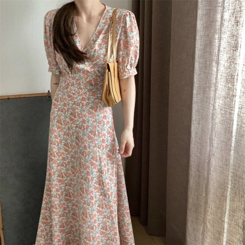 春夏新作気質フローラルプリントシフォンワンピース女性スリムスリムVネックロングスカート 韓国婦人45780586564