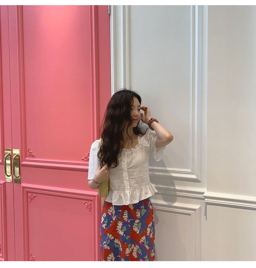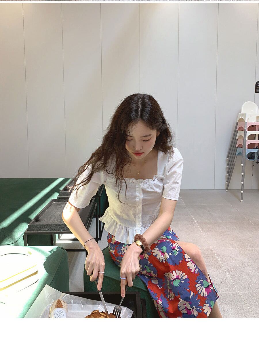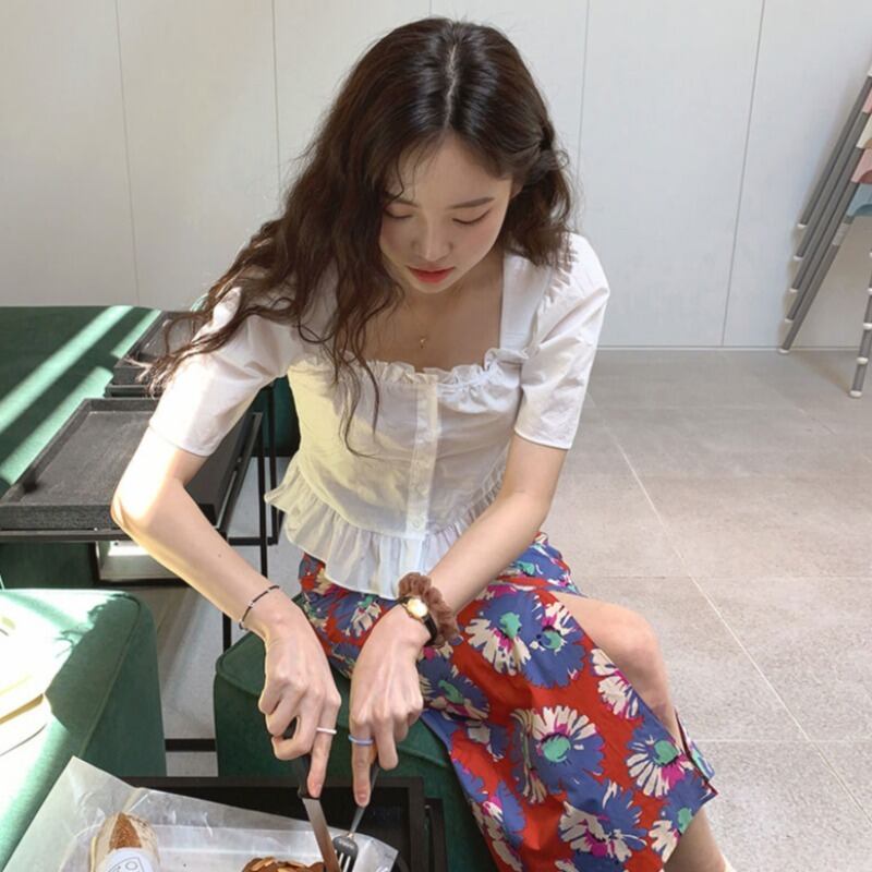 夏のハイウエストaラインスプリットフローラルスカート+パフスリーブシャツ、スモールツーピーススーツ、ウエスタンスタイル 韓国婦人10974841461