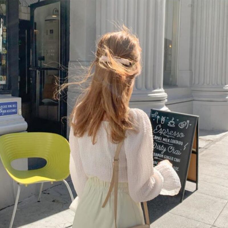 シックな気質甘い深いVネック漏れ鎖骨プリーツバブルコットンスリミングランタンスリーブシャツトップ女性 韓国婦人35292747109