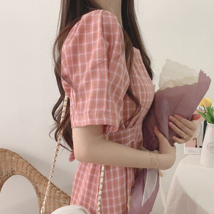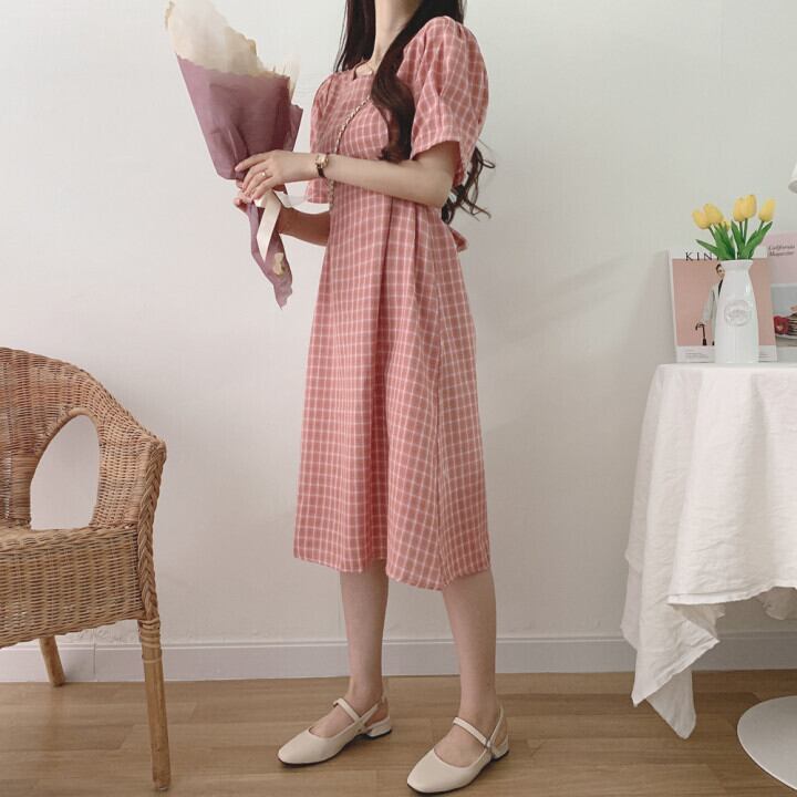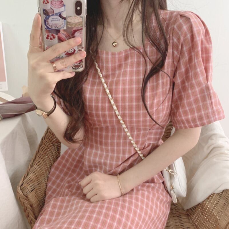 レトロチェック柄ワンピースレディースミドル丈2020夏ウエストスリミングスクエアカラースーパーフェアリースイートスカート 韓国婦人87993877927