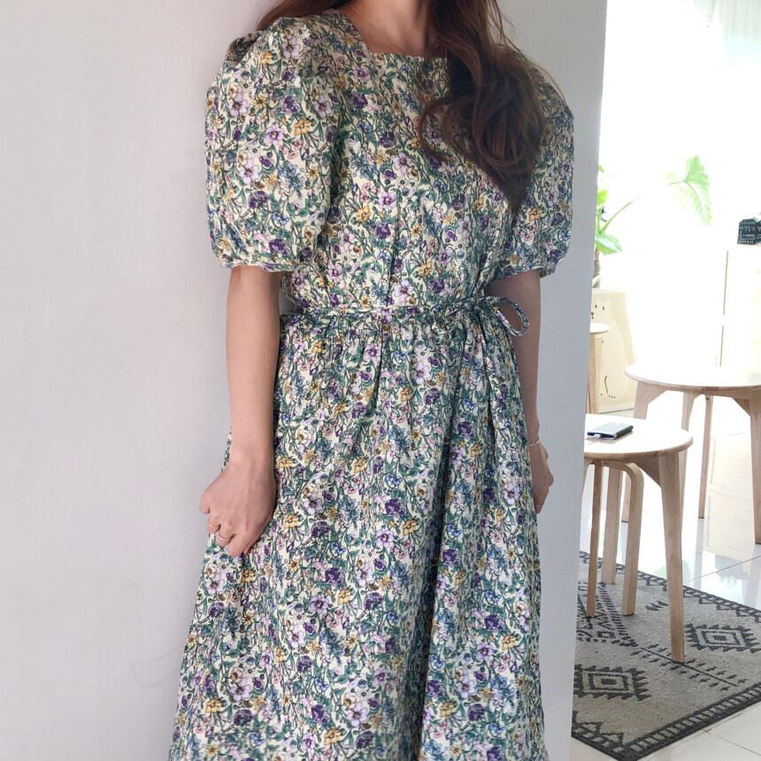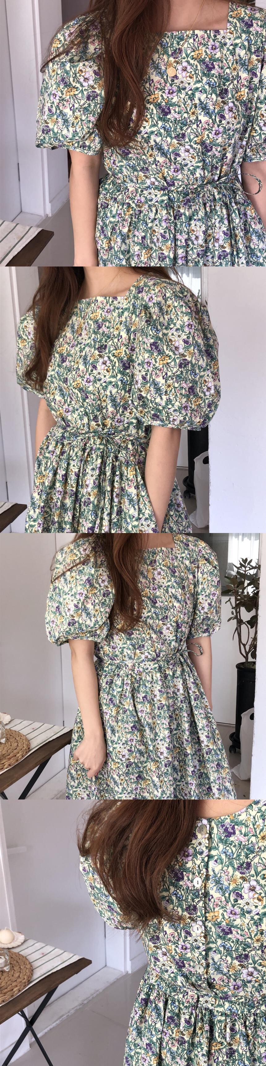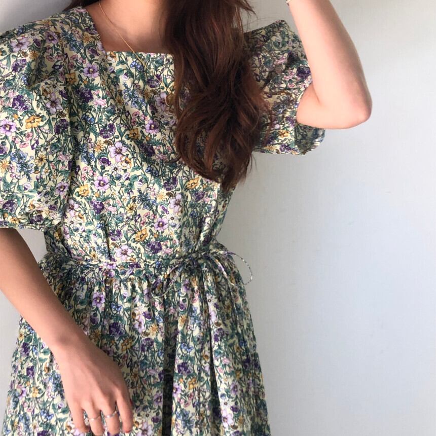 シックなレトロなウエスタンスタイルの薄いスクエアカラールーズネクタイウエストパフスリーブ小さな花柄ドレスロングスカート女性 韓国婦人92616328147