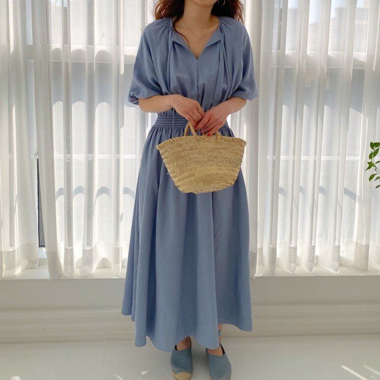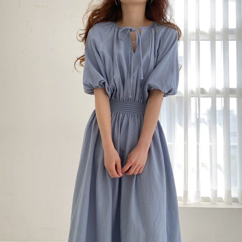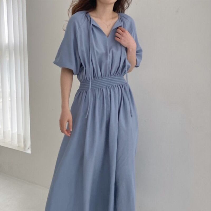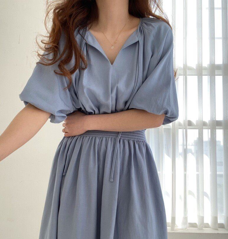 シックなフレンチレトロフォグブルーホワイトVネック伸縮性ウエストロングオーバーザニーランタンスリーブドレス女性 韓国婦人51957785822