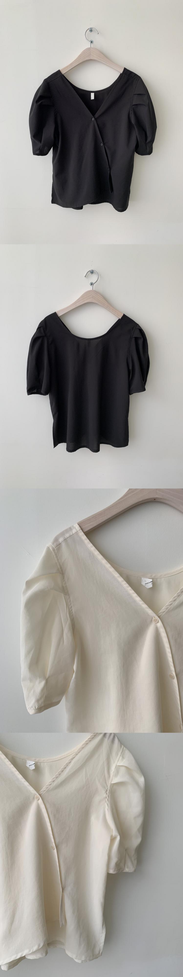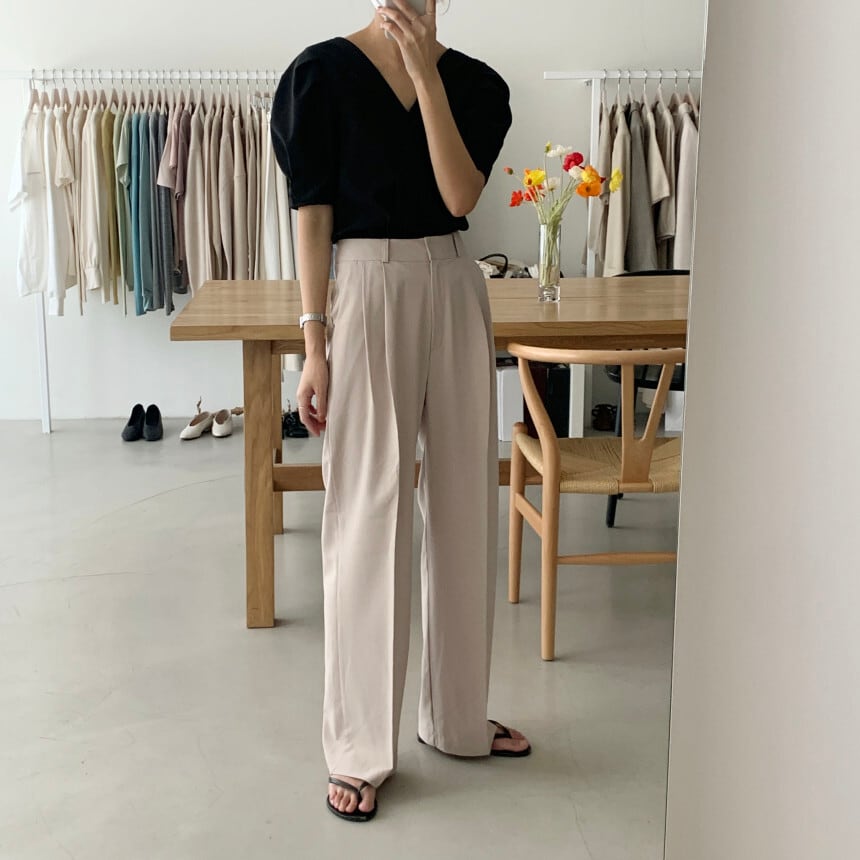 insニッチワイルドVネックイレギュラーシングルブレストパフスリーブシャツ+ハイウエストストレートモップカジュアルパンツ 韓国婦人58671777648