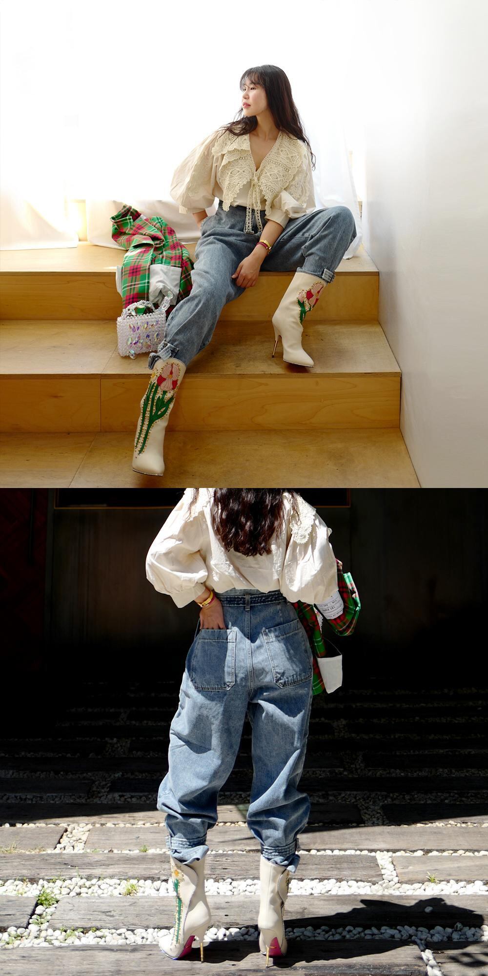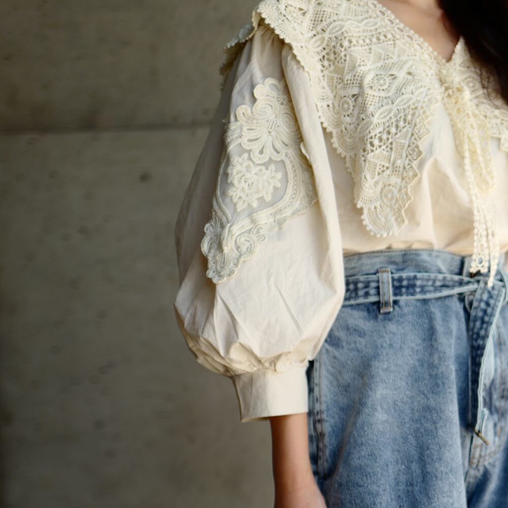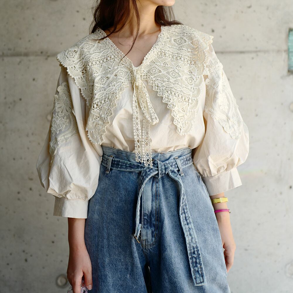 刺繍入りラージラペルレースパフスリーブシャツ 韓国婦人48518557139