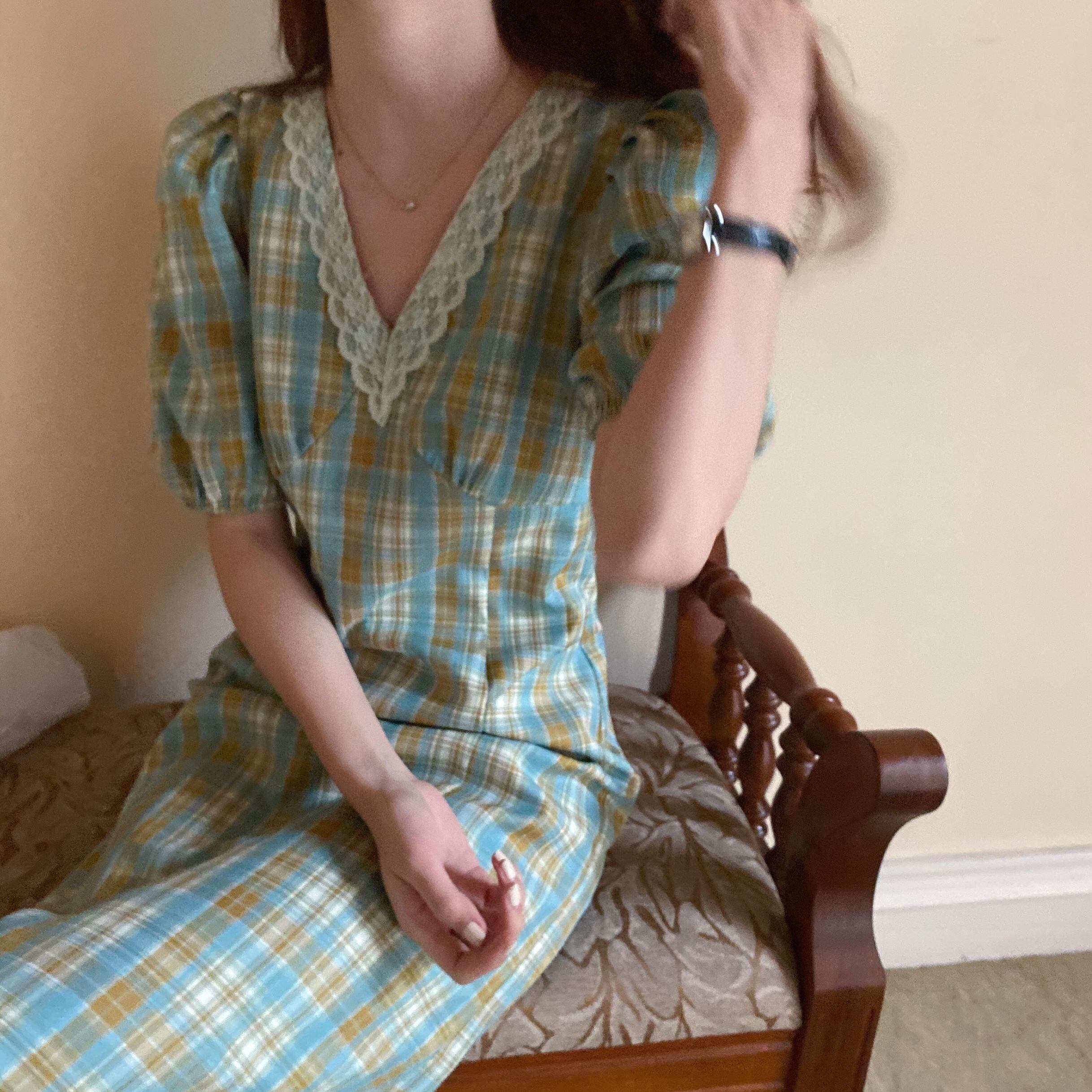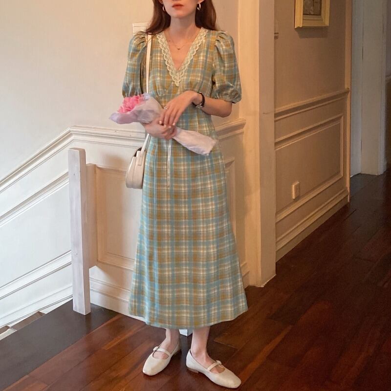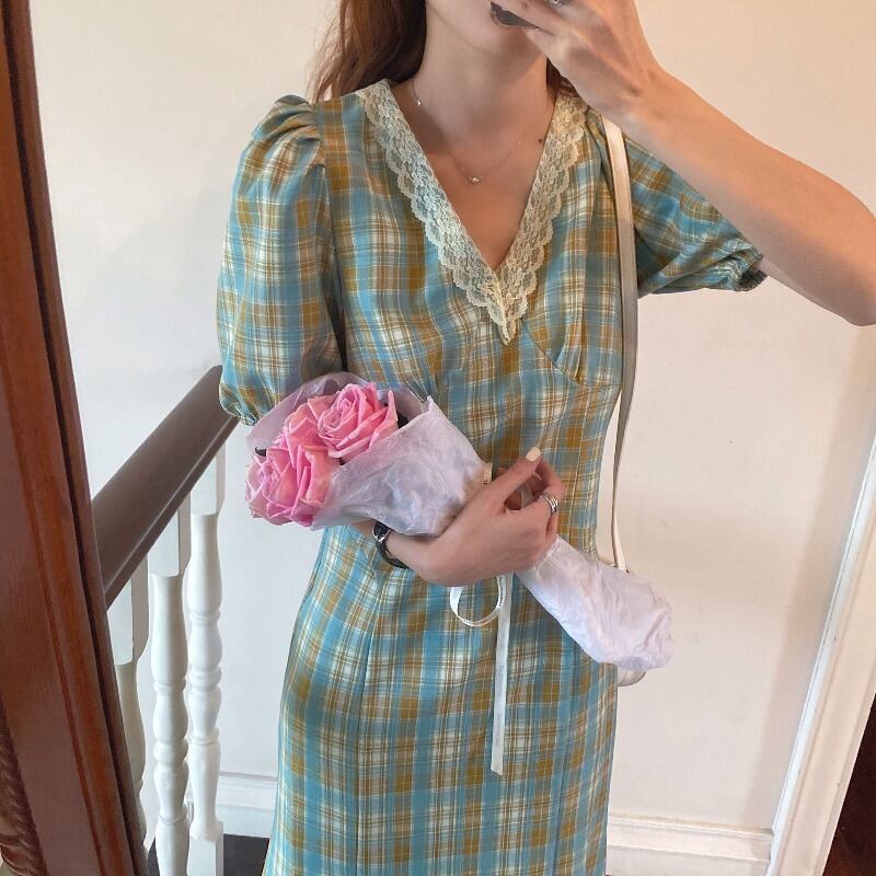 緑の格子縞のドレス女性の春と夏のVネックパフスリーブスカートフレンチレトロは薄い気質のベルフラワースカートを示しています 韓国婦人51604190034