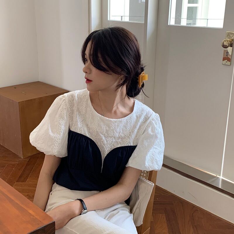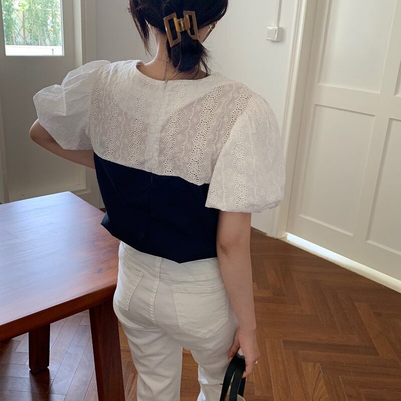 シックなエインパレススタイルラウンドネック中空かぎ針編みステッチフェイクツーピースデザインショートパフスリーブシャツ女性 韓国婦人37103138258