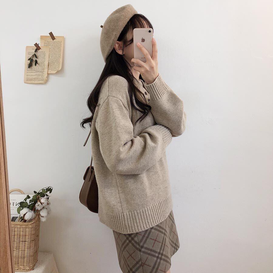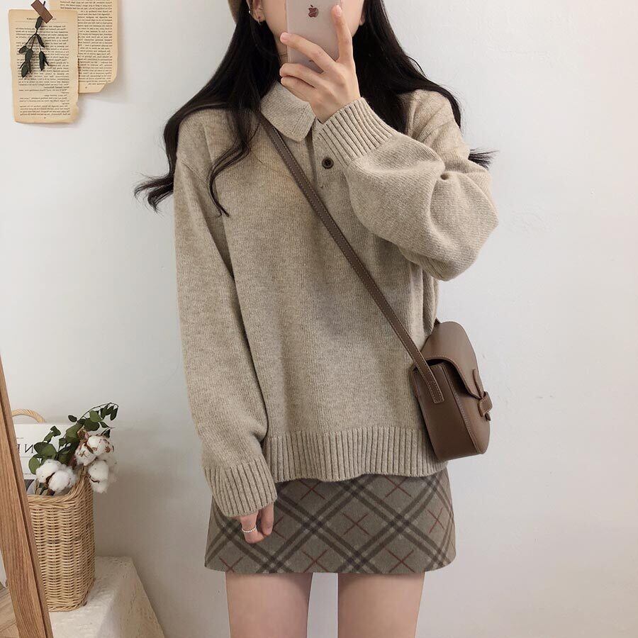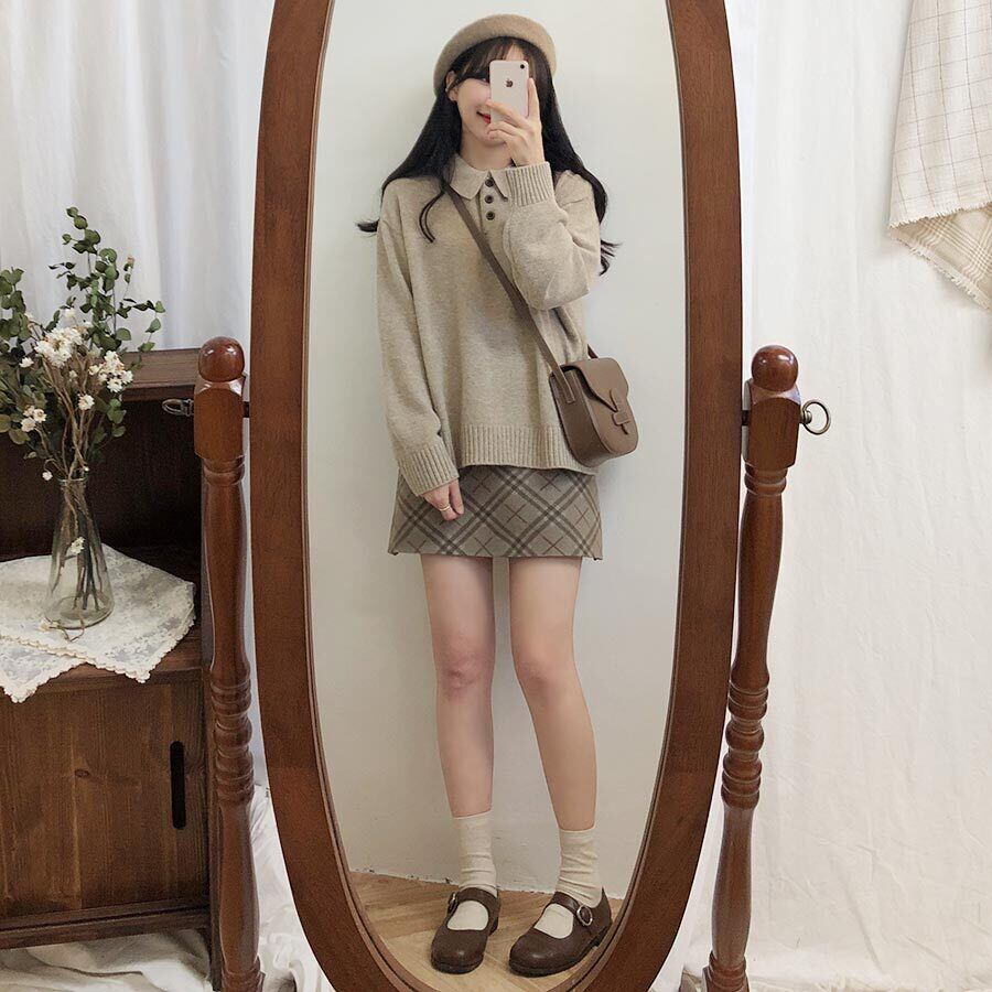 秋冬レトロ香港スタイルルーズポロセーターハイウエストチェック柄スカート気質ウエスタンスタイルファッションスーツツーピーススーツ 韓国婦人94978611323