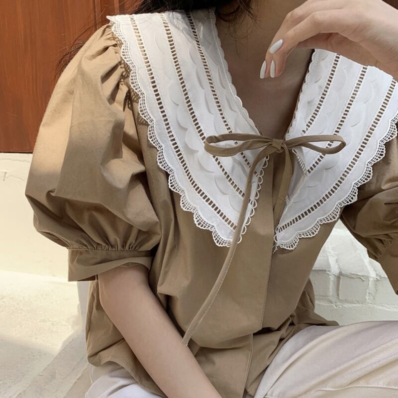 シックなスウィートとウエスタンスタイルのラペルレースステッチレースボウデザインルーズパフスリーブシャツ 韓国婦人41063841024