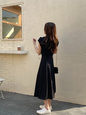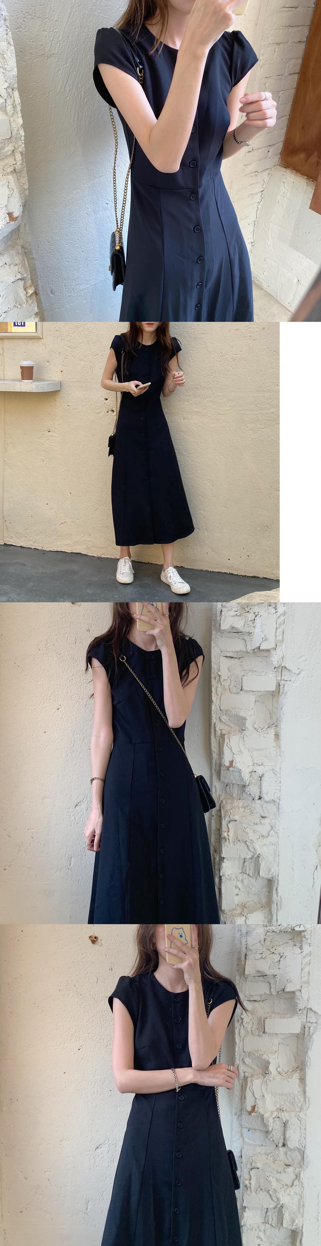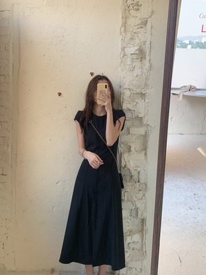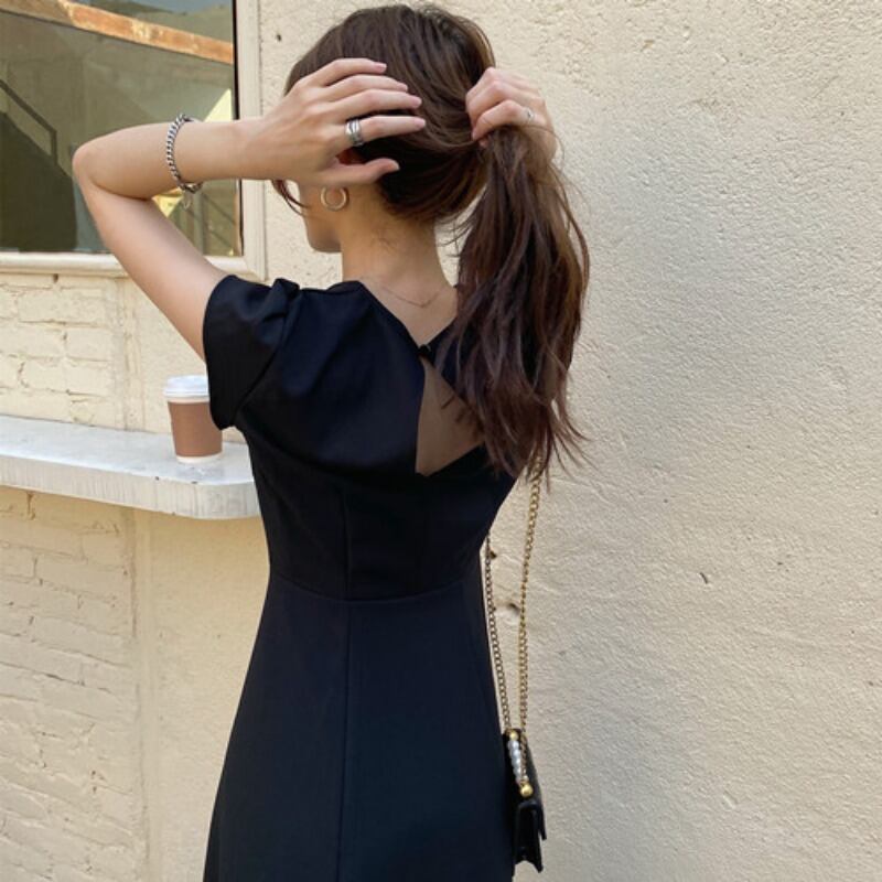 シックなレトロなヘップバーンスタイルのラウンドネックシングルブレストバックホローデザインウエスト半袖ドレスリトルブラックドレス 韓国婦人98774126852