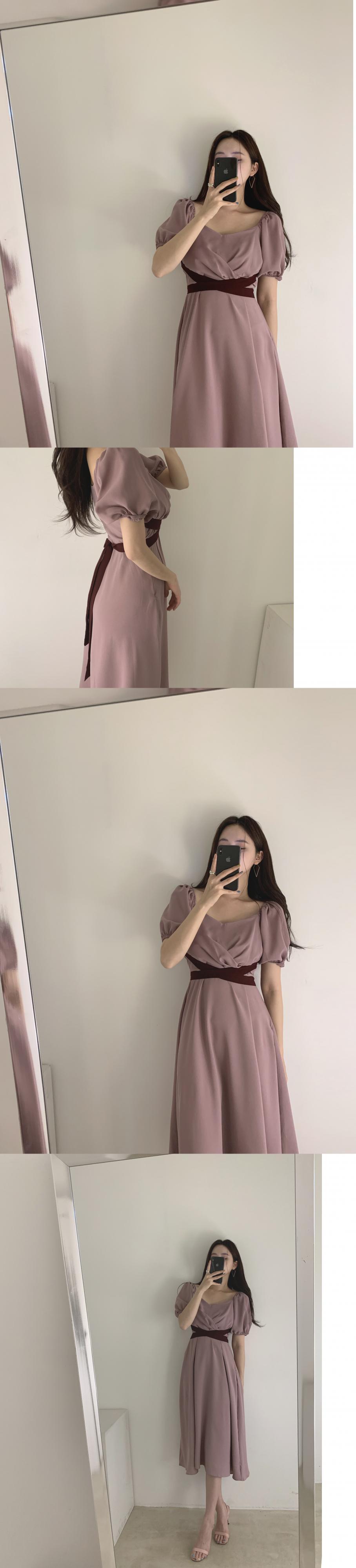 インの夏の新しいスタイルのエレガントなピュアカラーベルトのフロントとバックのハイウエストVネックパフスリーブロングドレスのバージョン 韓国婦人47990662211