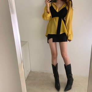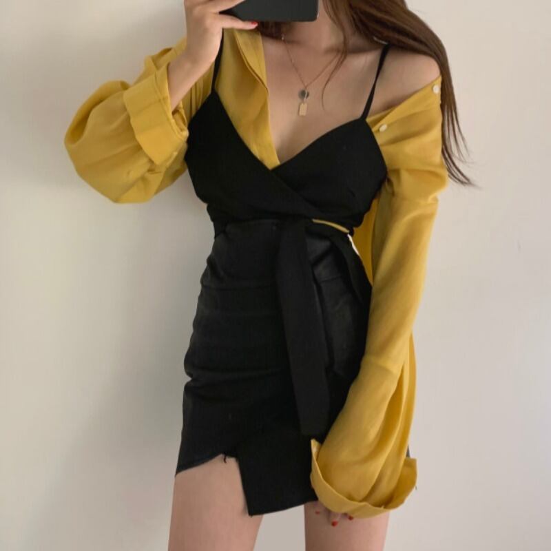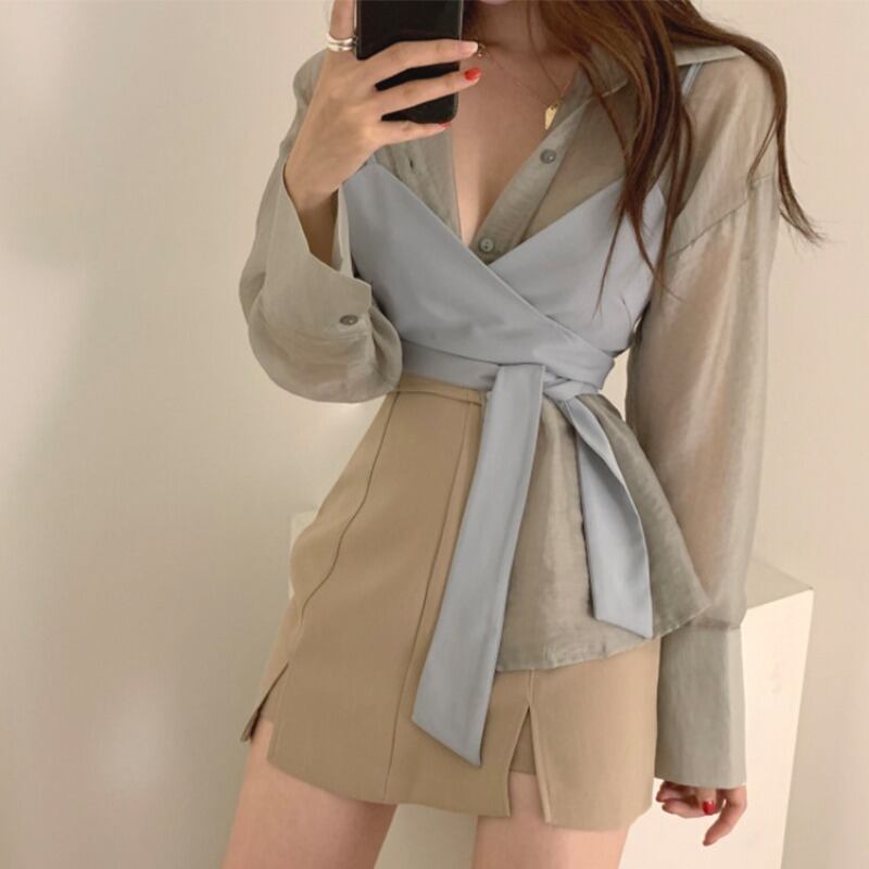 シックな秋のレトロホワイトとやや透明感のある長袖ボトミングシャツ+スリムウエストストラップ巻きチェストスーツ女性 韓国婦人61038822798