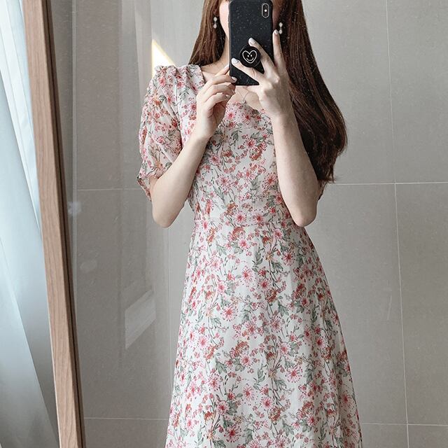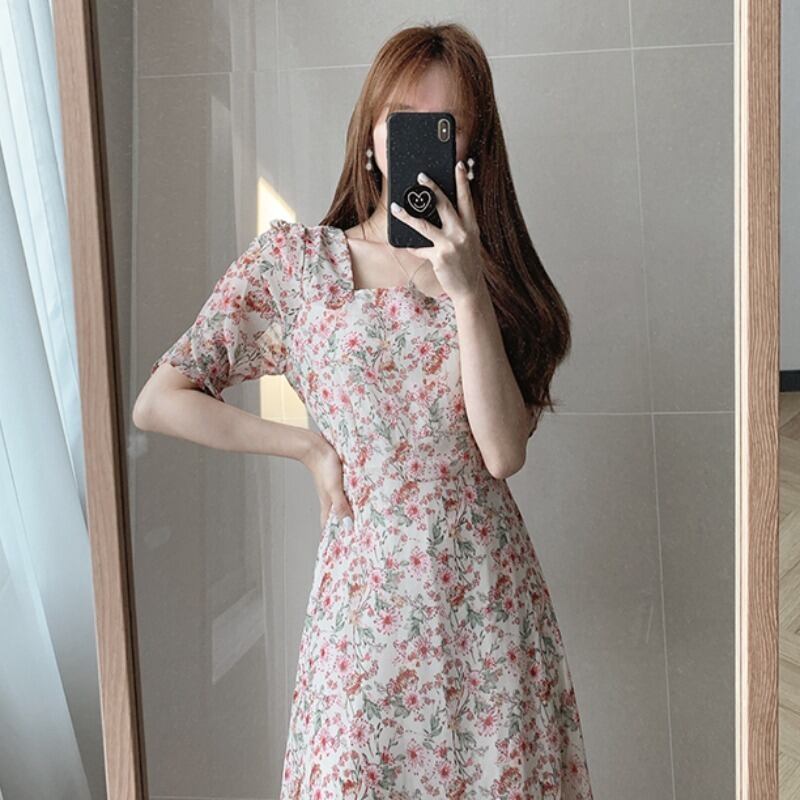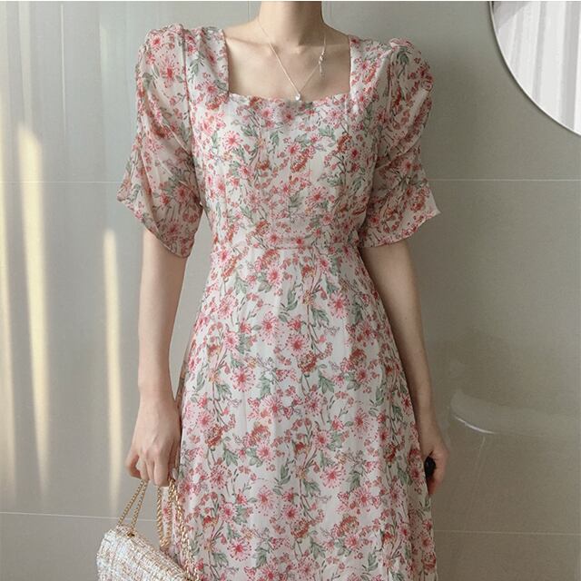 シックな夏のレトロフレンチライトクックドウィンドスクエアネックパフスリーブシフォンフローラルドレス半袖ミドル丈ドレス 韓国婦人99502950404