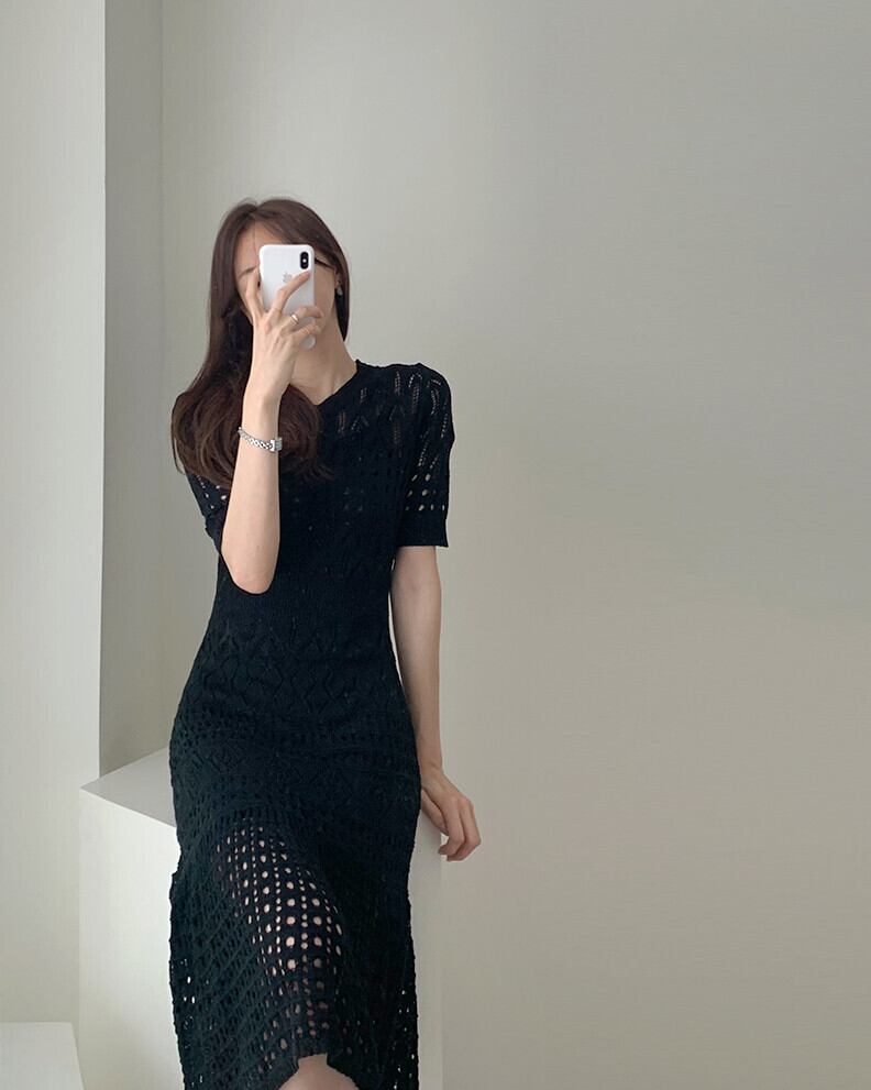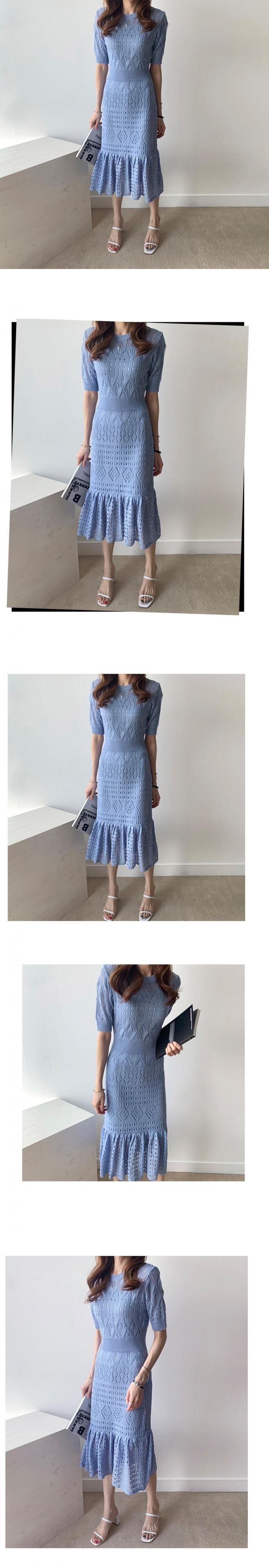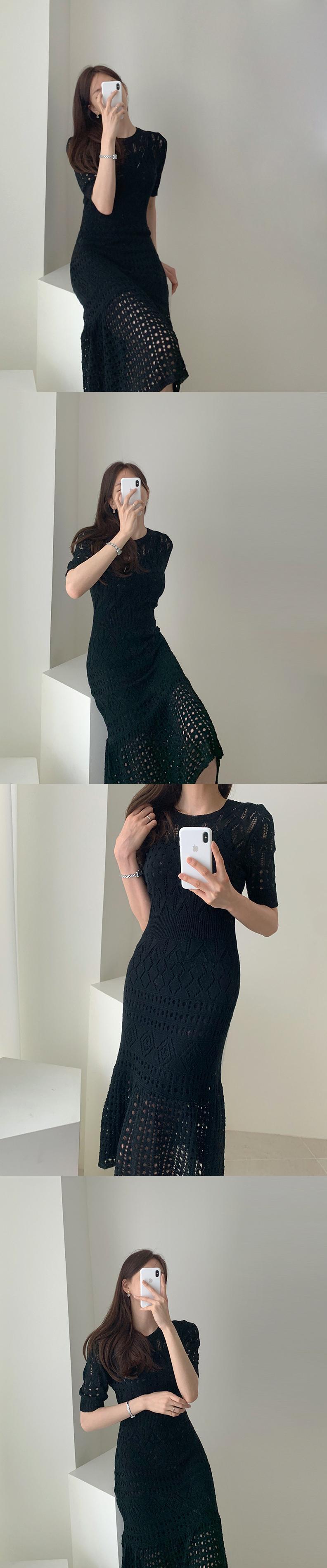 シックで優しいラウンドネックホローデザインハイウエストスリムスリミングアイスシルクニットバッグヒップフィッシュテールドレス女性 韓国婦人90715629440