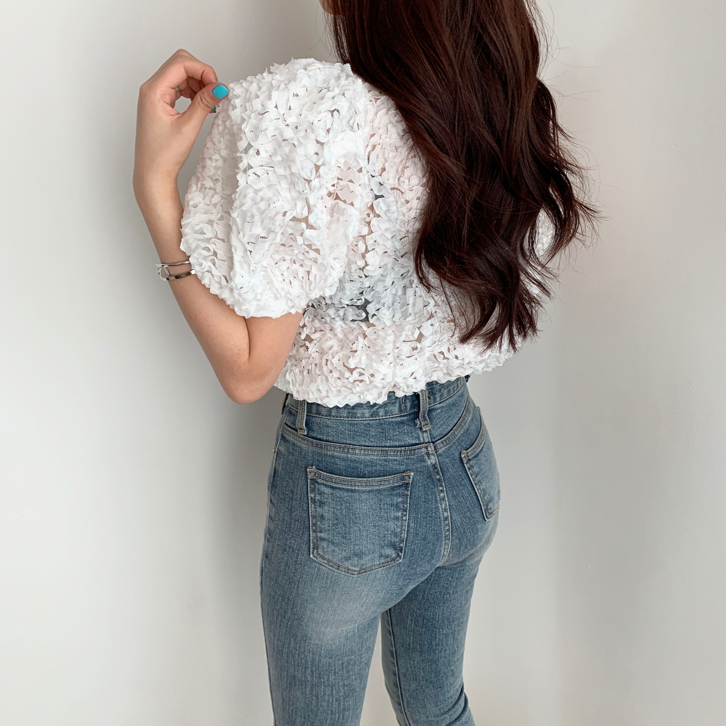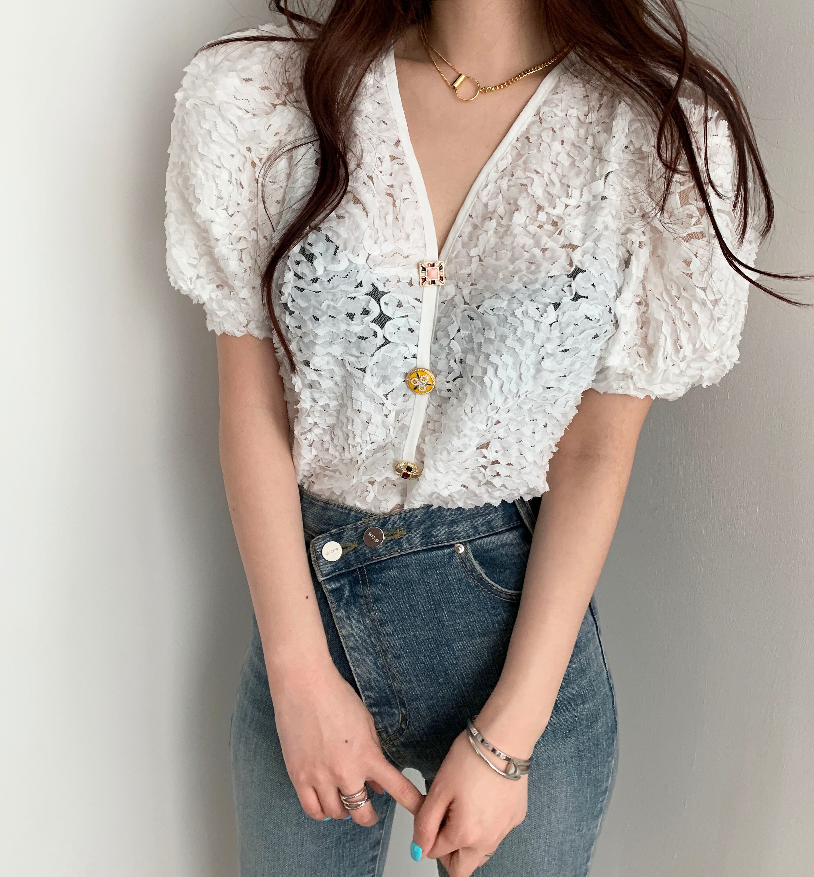 夏のデザインニッチ気質レースパフスリーブトップ女性スーパーフェアリールーズVネック中空シャツ 韓国婦人5834871331