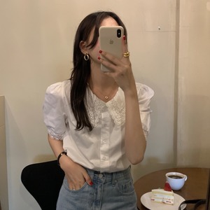2020年春夏パフスリーブラペルフレンチデザインセンスホワイトシャツウエスタンスタイルスモールシャツ刺繡レースブラウスレディース 韓国婦人2627449285