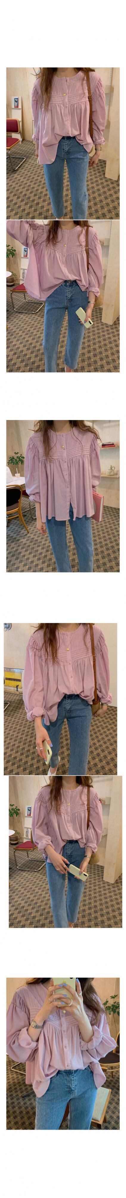 シックなゴーストホースの甘い年齢を減らすプリーツパフスリーブラウンドネックシングルブレスト長袖シャツトップ女性 韓国婦人22425674621