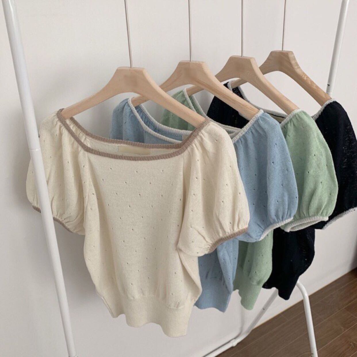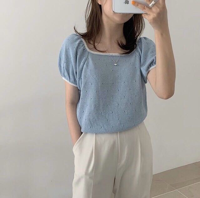 夏の新しいシックな中空半袖Tシャツパフスリーブセーター薄片女性の夏のスクエアカラートップ 韓国婦人17246224413