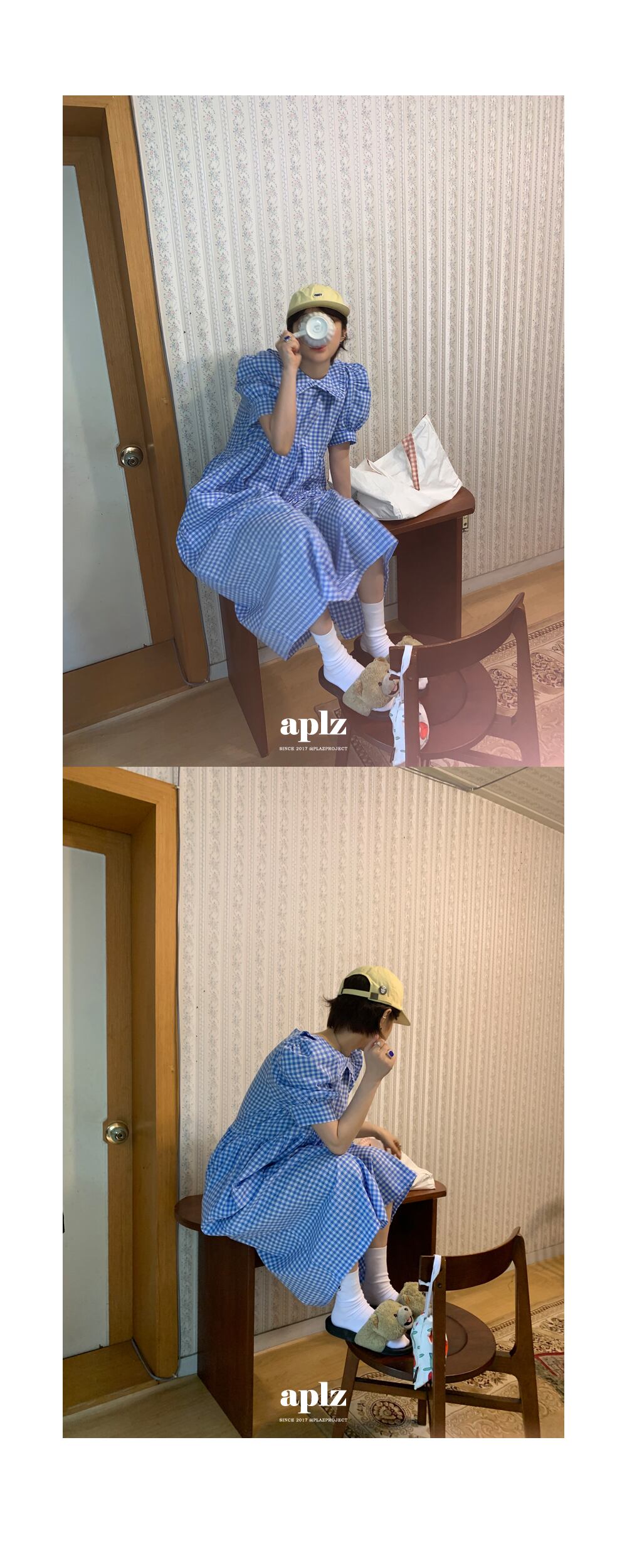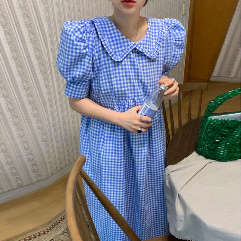 2020年夏の新作シックドールカラーパフスリーブスカートミドル丈ルーズチェック柄ワンピースレディース 韓国婦人72855321776