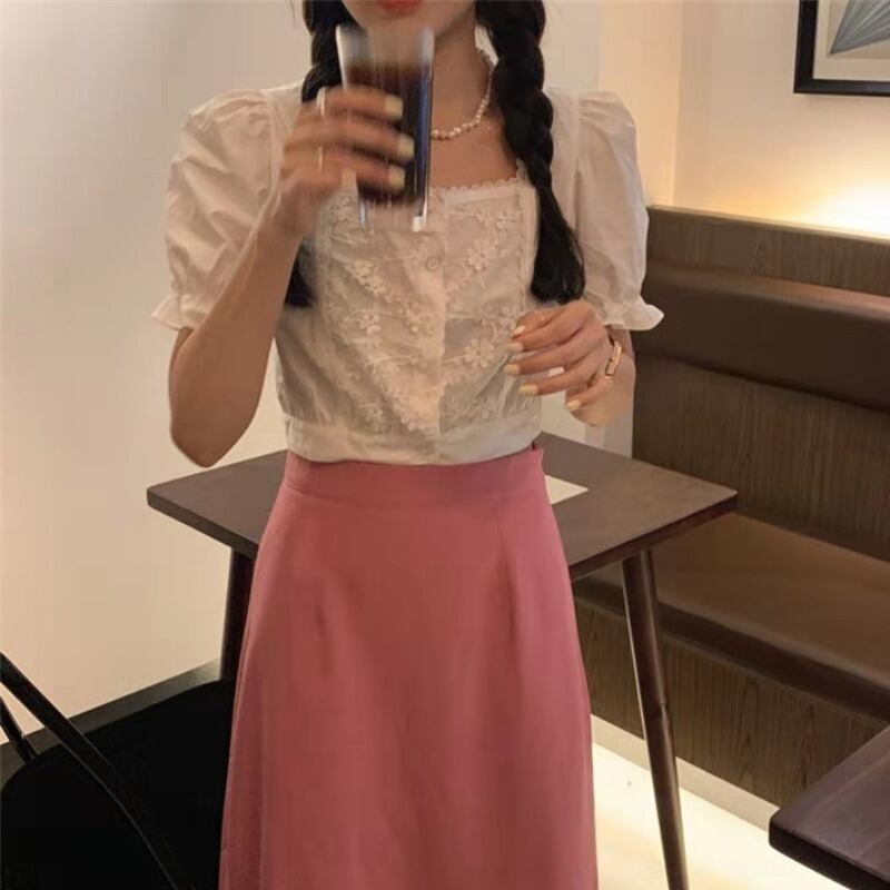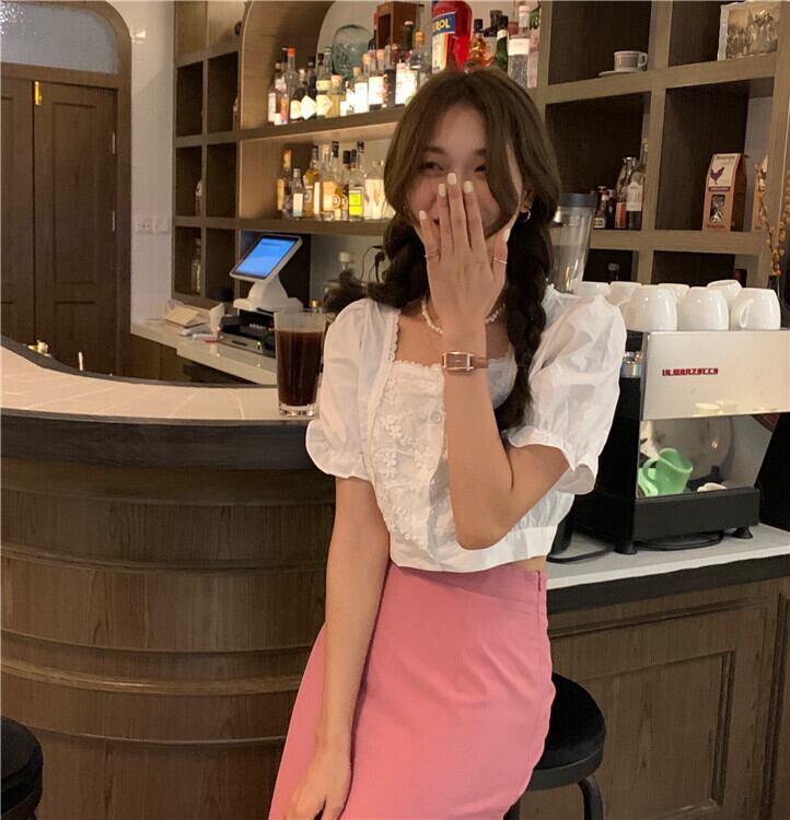 2020年新作サマードレススクエアカラー鎖骨ショートクロップドカーディガントップスリム半袖シャツ女性デザインセンスニッチ 韓国婦人39050914253