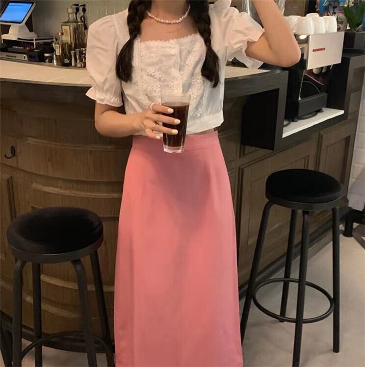 色:ピンクのスカート,白のシャツ