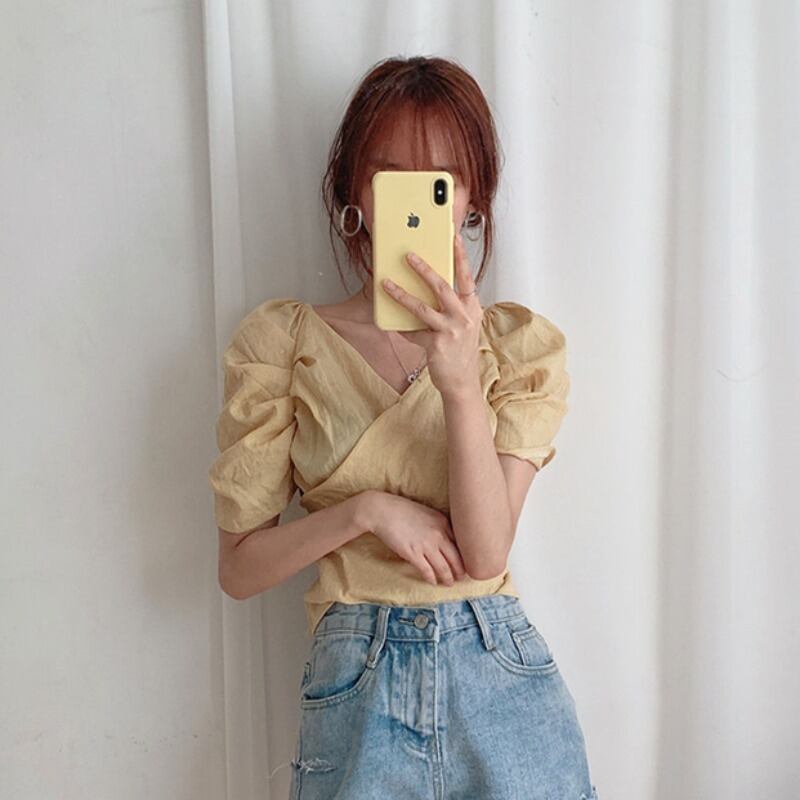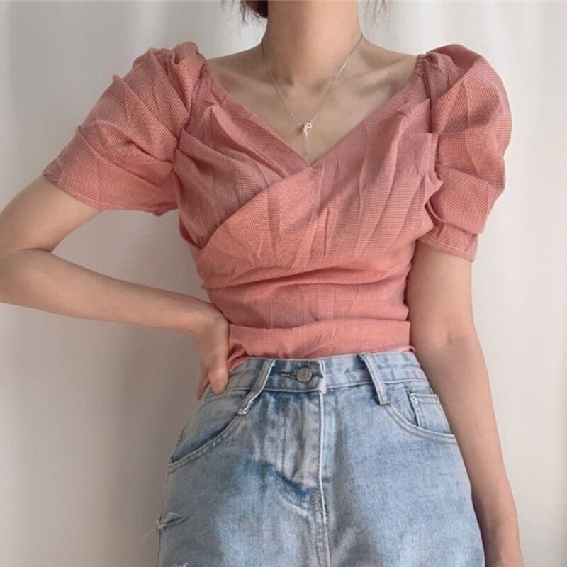 夏のシックなフレンチレトロVネックパフスリーブシャツクロスウエストチェック柄シャツは薄手のブラウス女性でした 韓国婦人26200219328