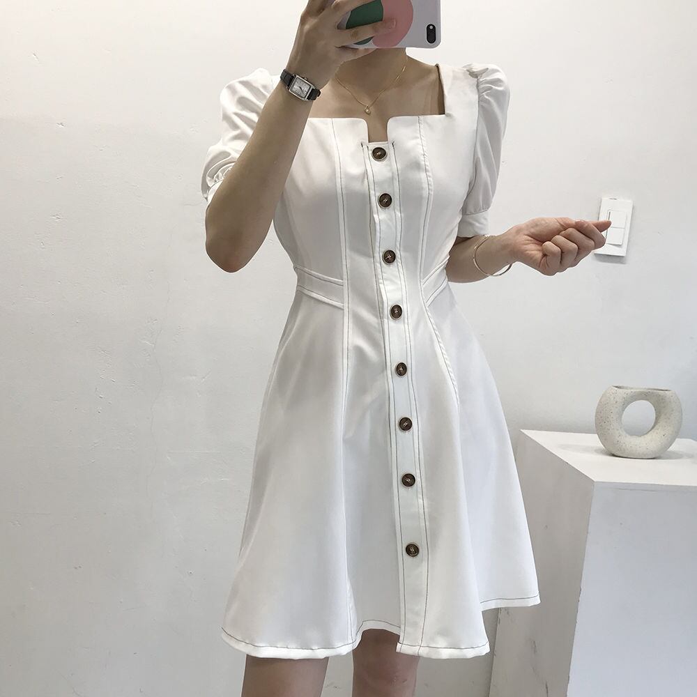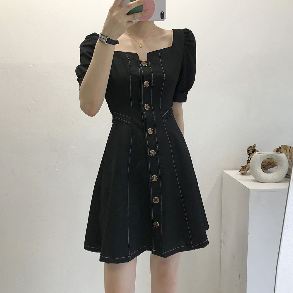 2020年夏の新しいフレンチレトロパフスリーブドレス気質スクエアネックウエスト細いAラインスカートeign女性 韓国婦人17697635837