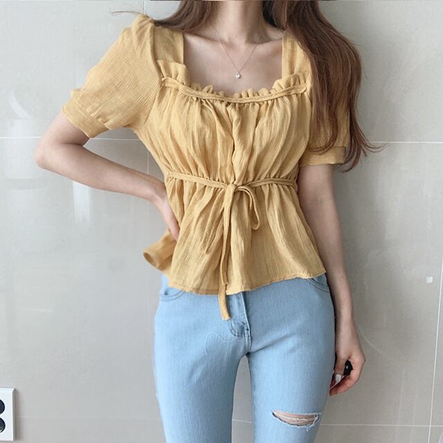 シックなフレンチデザインセンススクエアネック木製耳しわレースウエスト薄パフスリーブシャツシャツ女性 韓国婦人85979148195