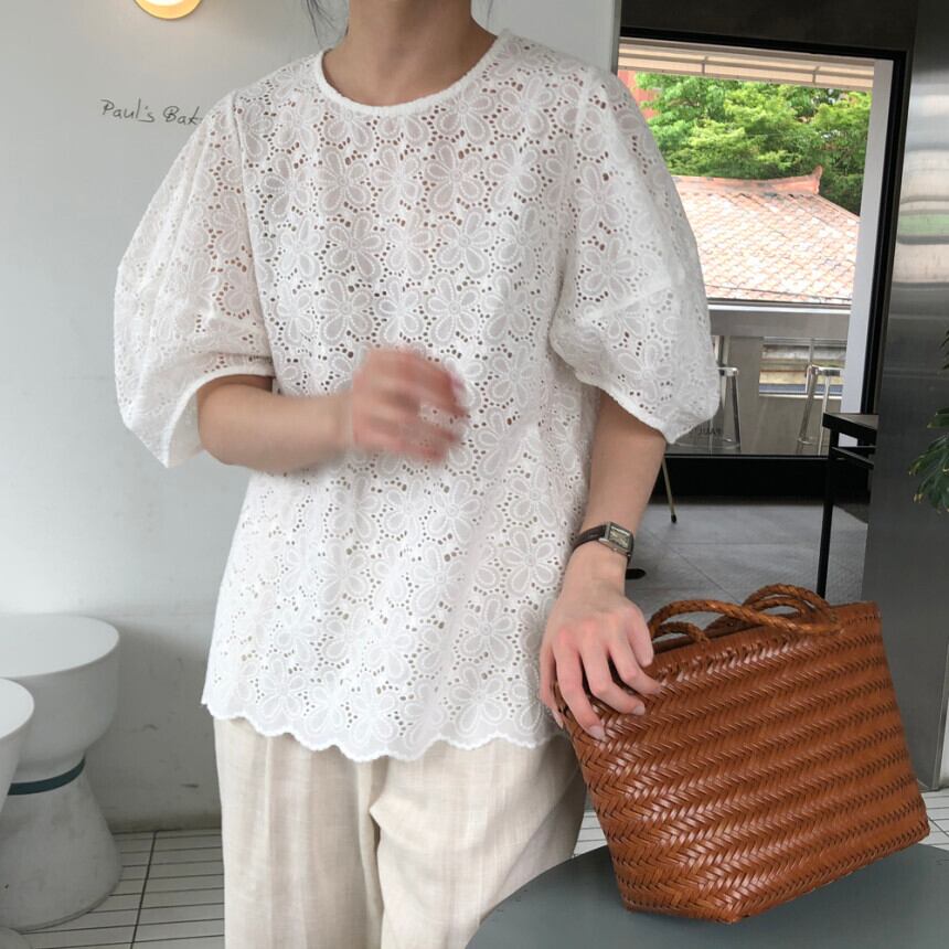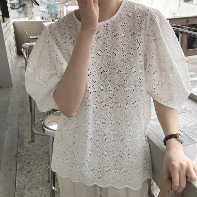 レースシャツメスホワイトバージョン2020夏Tシャツスーパーフェアリー半袖トップパフスリーブ中空刺繡小フレッシュ 韓国婦人80601898957