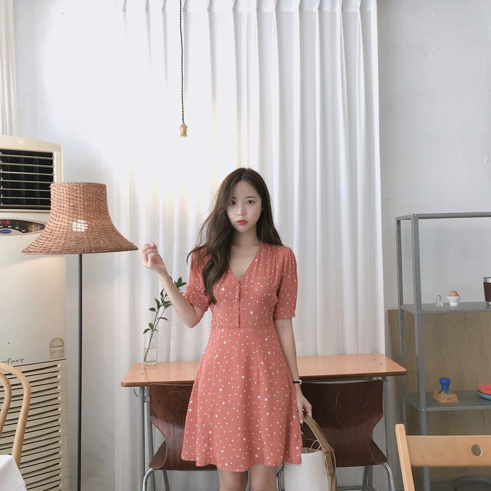 ウエストと細いAラインスカートが付いた甘い水玉Vネックの小さなフレッシュドレス2020夏の新しいフレンチニッチ 韓国婦人98479543202
