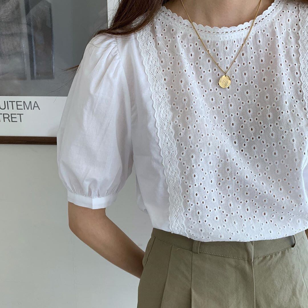 サマーラウンドネック刺繡かぎ針編みホローパフスリーブシャツ+ウエストストレートショーツレディースセット 韓国婦人26842877012