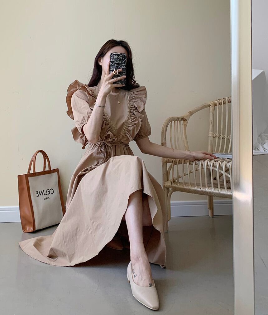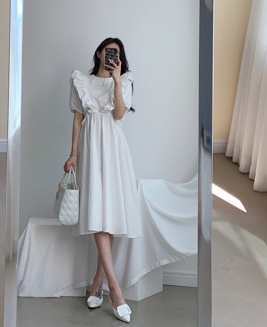 夏のラウンドネックウエストスリミング半袖ネクタイステッチレースワンピース優しい蓮の葉妖精ロングスカート 韓国婦人87888140860