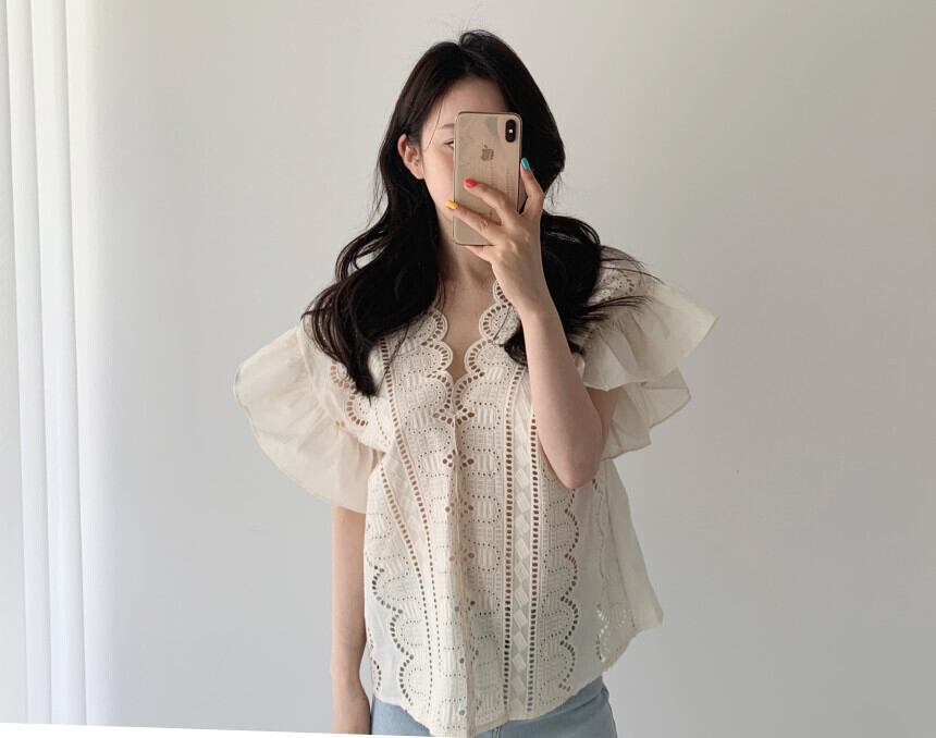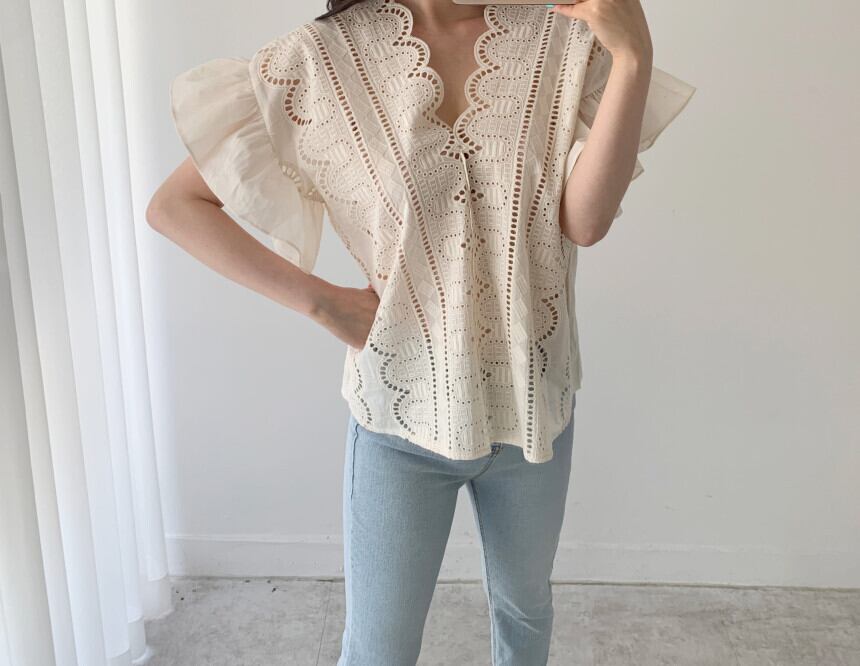 夏の新インヘビーインダストリーレースホロージャカードステッチVネックシャツフリルパフスリーブトップ女性 韓国婦人21591939762