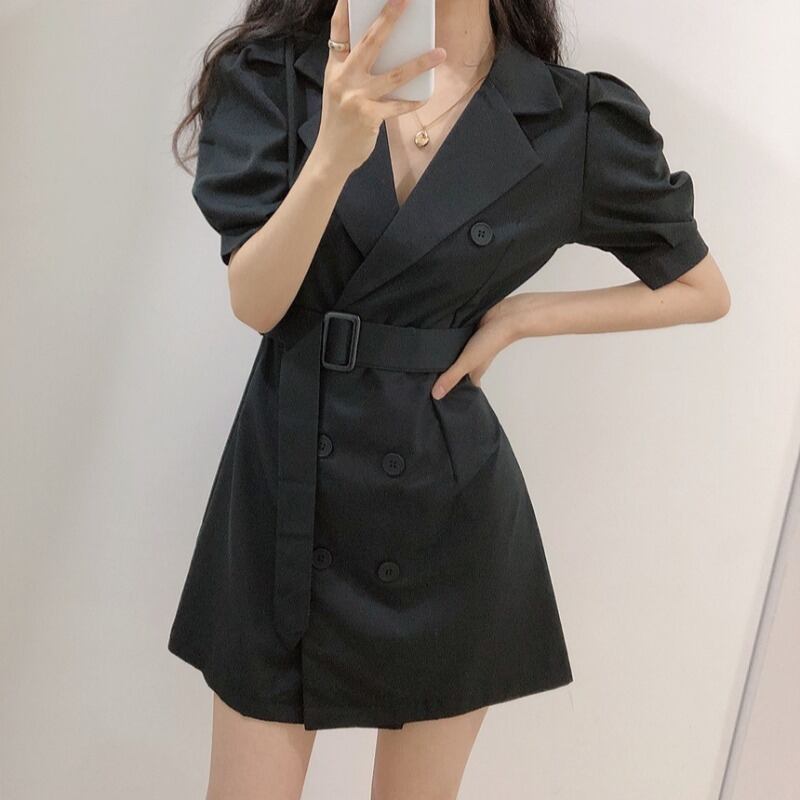 夏の新しいシックな気質レトロなダブルブレストのウエストネクタイは薄手のスーツ半袖ミドル丈ドレス女性でした 韓国婦人78338011587