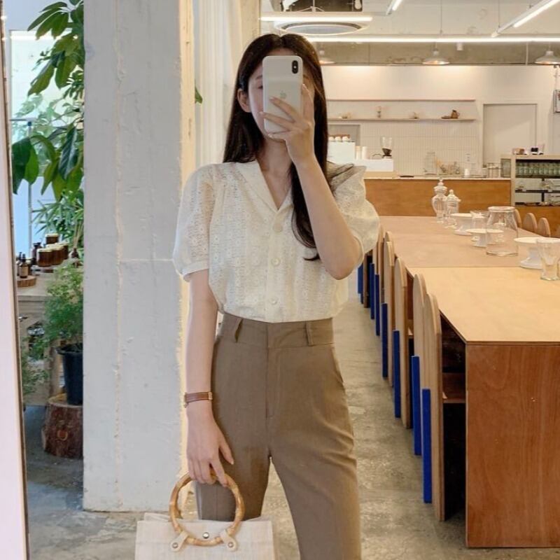 サマーレース刺繡の優しいパフスリーブシャツ+ウエストと薄いブラウンのストレートパンツセットの女性 韓国婦人8332667584