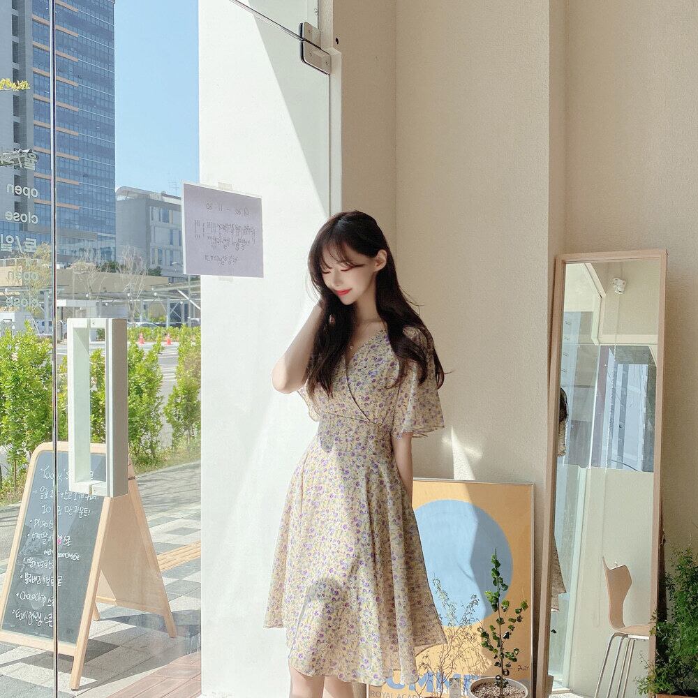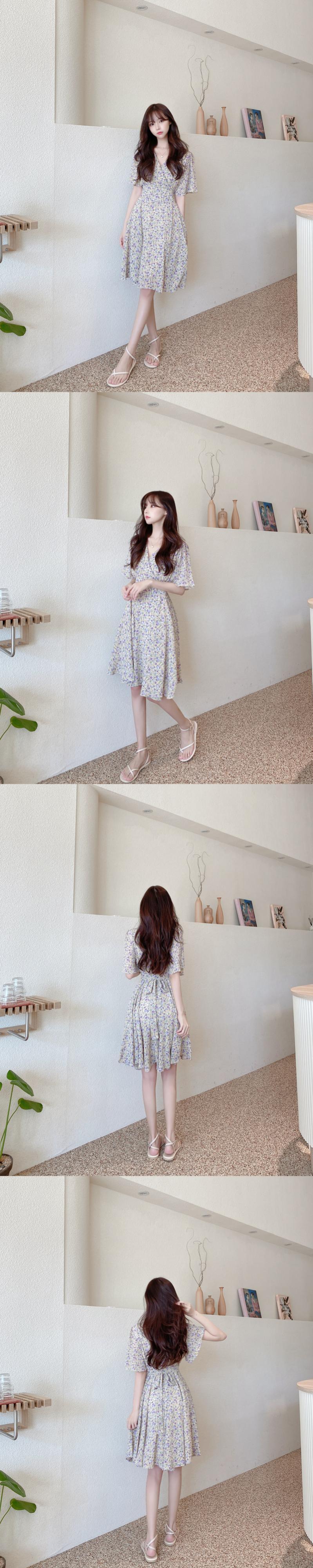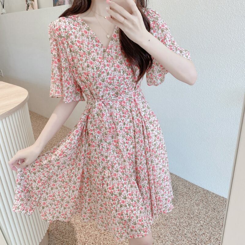 レトロなフローラルシフォンドレス、ショート、スモール、ウエスト、シン、Vネック、甘い初恋、フレッシュサマーニュースタイル 韓国婦人1155868618