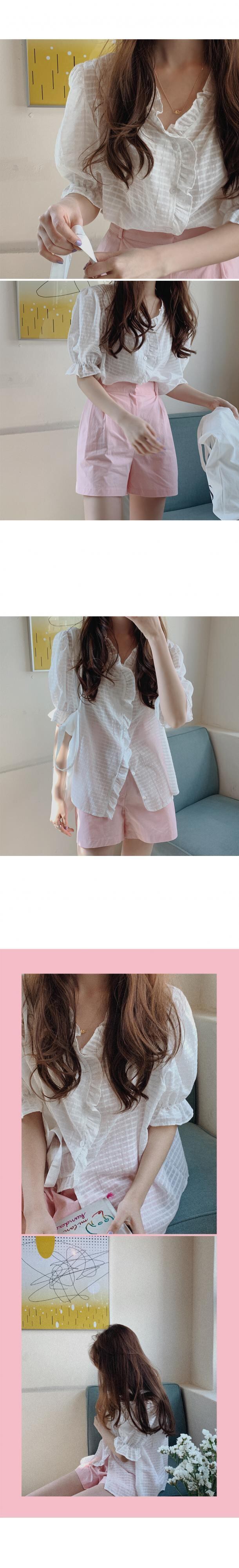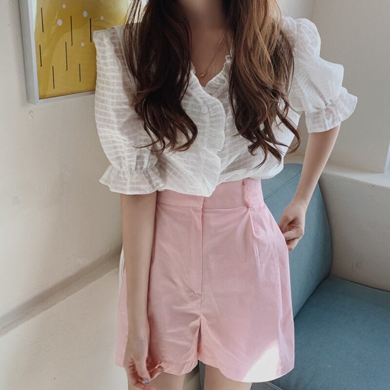 シックなウッドイヤーレースカラーシャツトップ+ピンクのハイウエストストレートカジュアルショーツ女性のファッションスーツ 韓国婦人70105640287