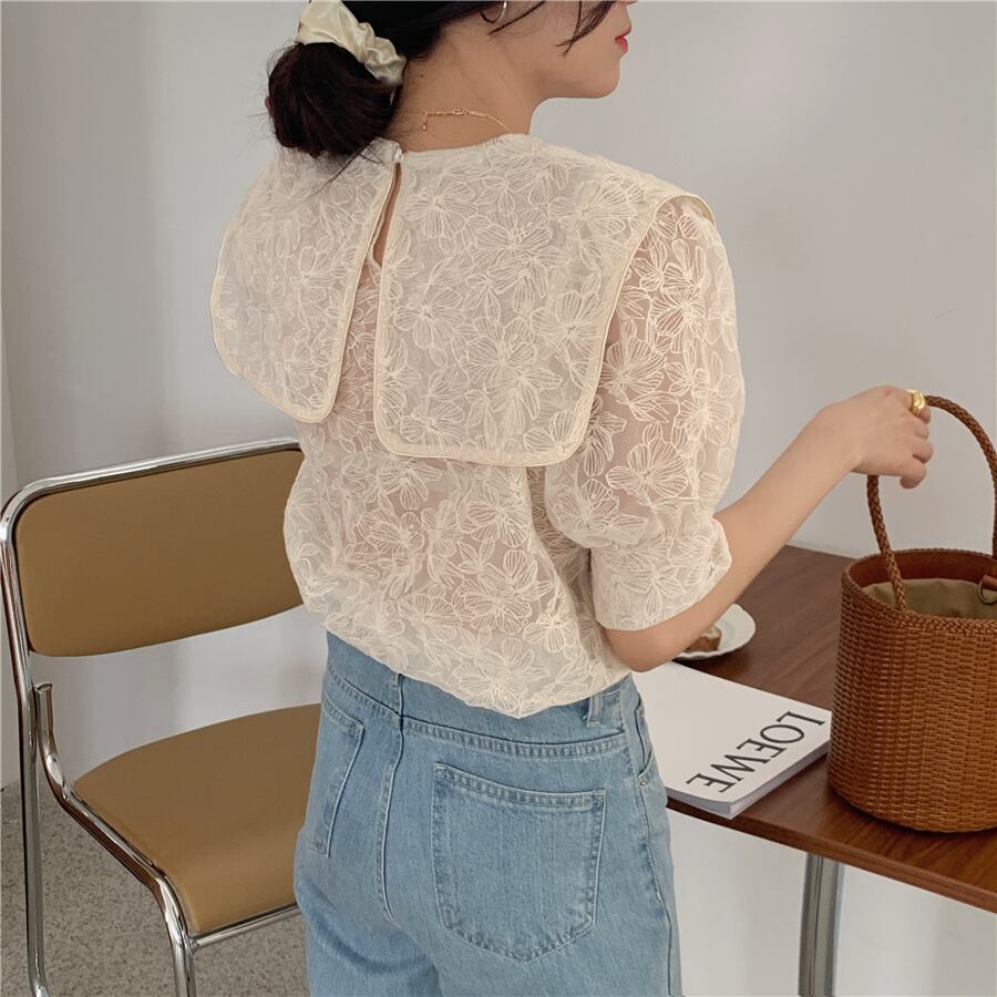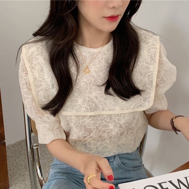 シックな夏の年齢削減優しいネイビーカラー刺繡レースかぎ針編みルーズパフスリーブシャツブラウス 韓国婦人47971809817