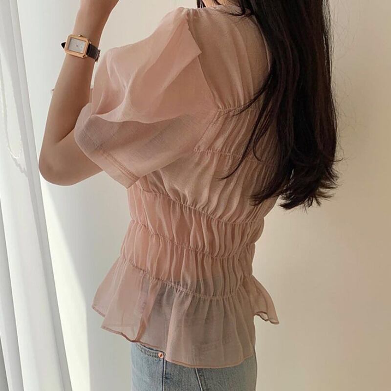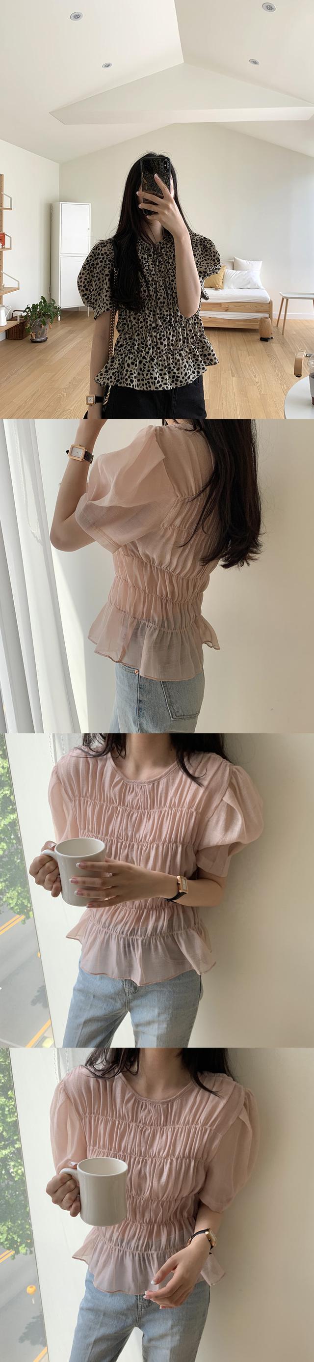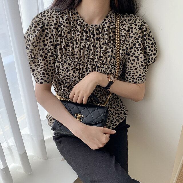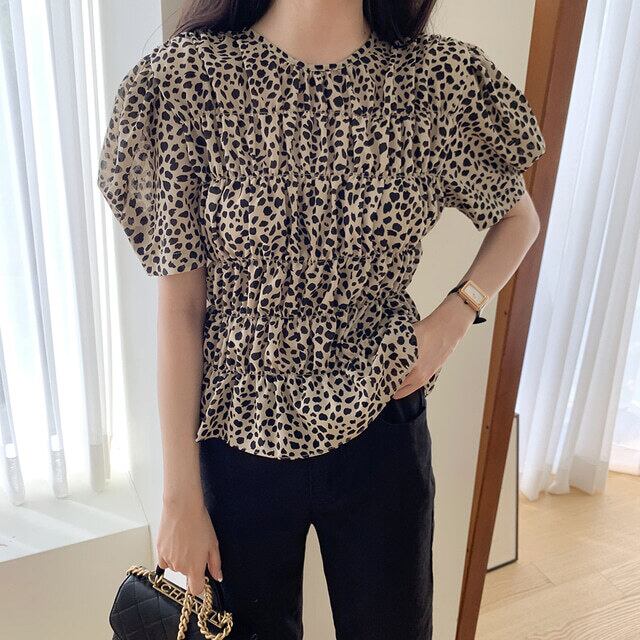 2020年夏の新しいワイルドプリーツトップヒョウ柄イン超薄気質半袖シャツ女性 韓国婦人60329979969