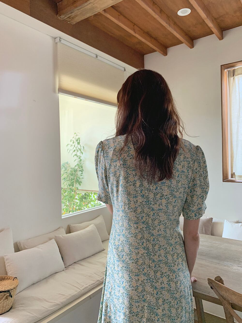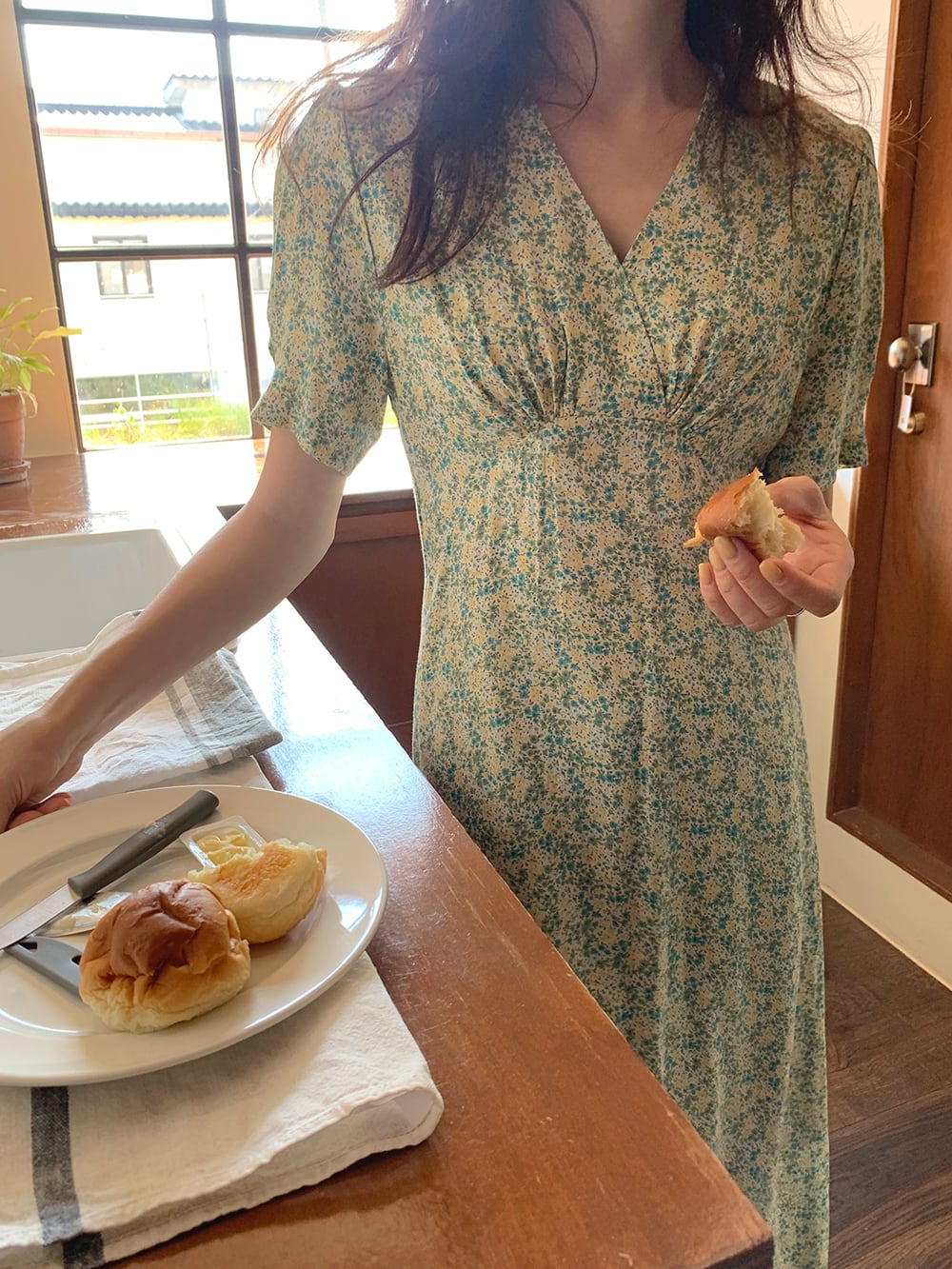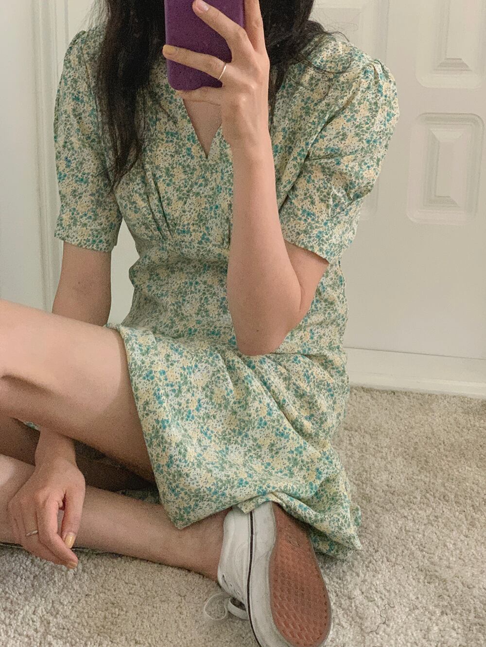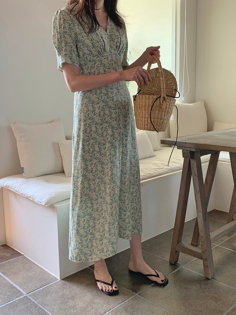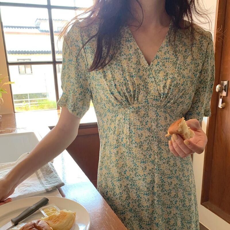 シックな夏のロマンチックな小さな新鮮なフルスクリーン花柄Vネック薄いハイウエスト半袖ドレスロングスカート女性 韓国婦人70484102794