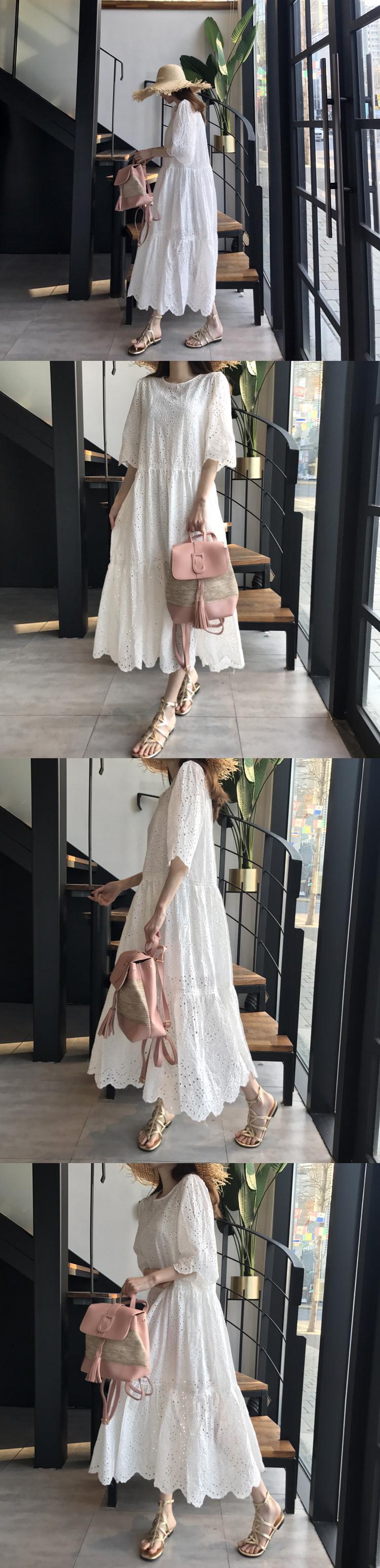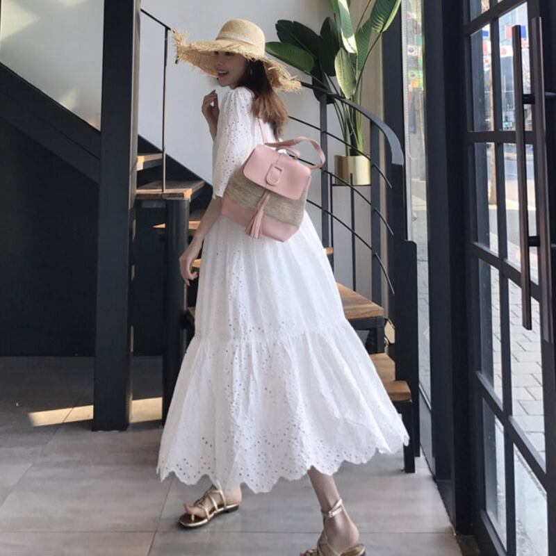 シックな夏のeignスタイルのラウンドネックは薄く、重工業の中空レースルーズラージスイングドレスロングスカート女性 韓国婦人4603031420