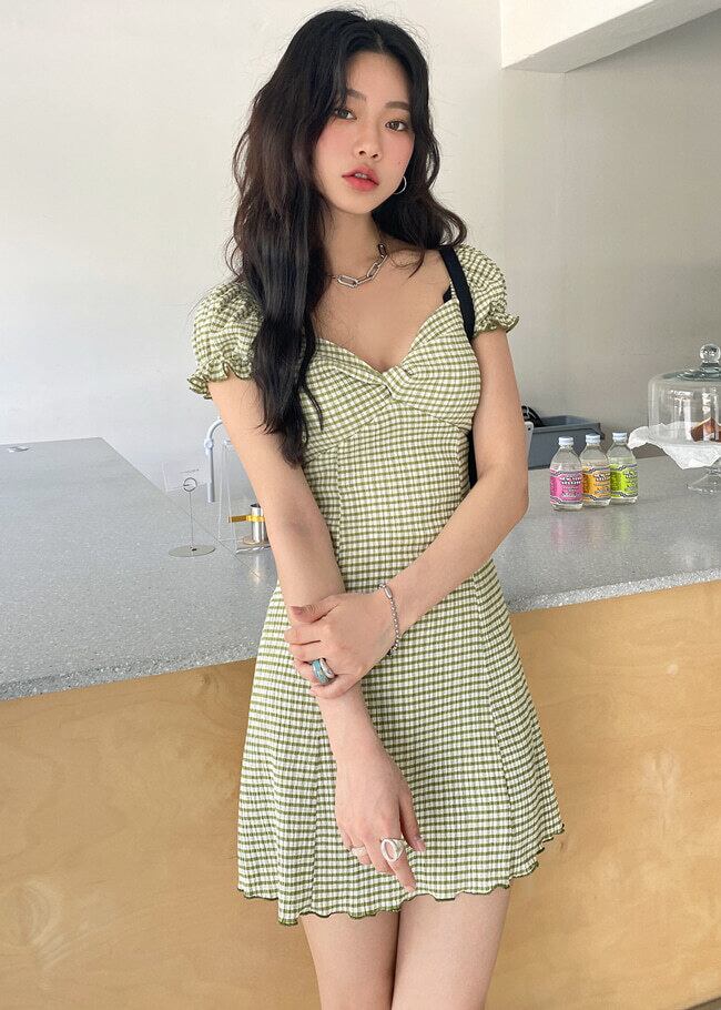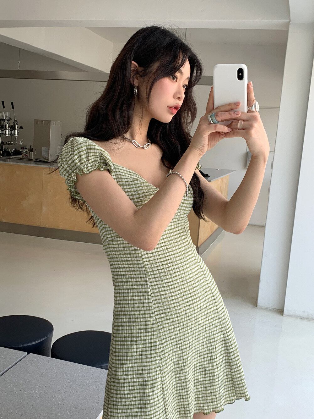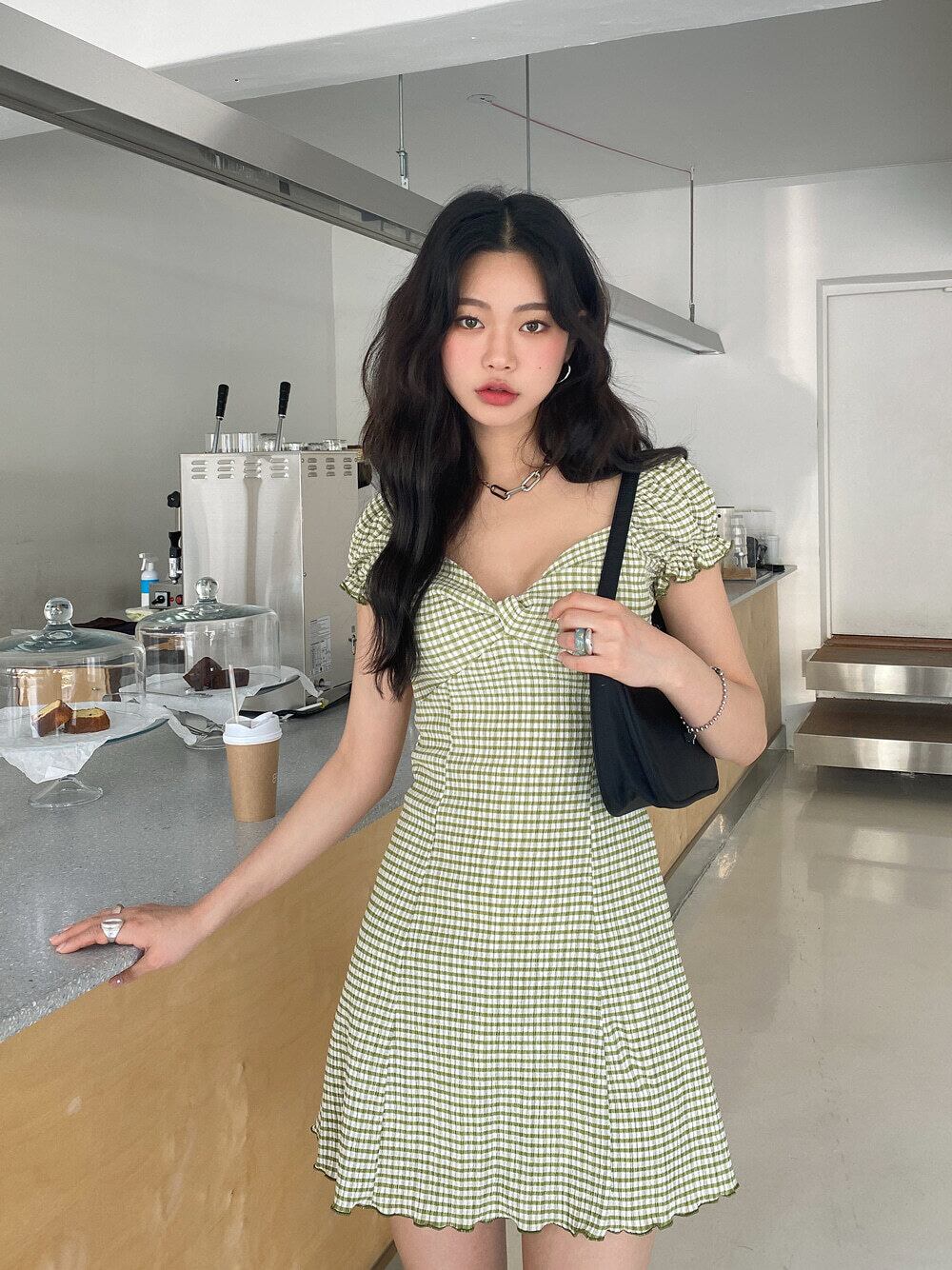 2020年夏の新しい妖精チェック柄レース半袖Vネックセクシーな背中の開いたウエストドレス女性セン 韓国婦人22872338092