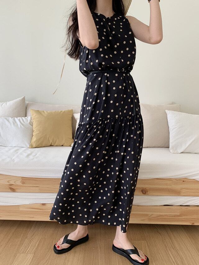 夏の新しいスタイルのシックなレトロワイルド薄い水玉ネックラインスプリットノースリーブロングスカートベストドレス女性 韓国婦人42284403740
