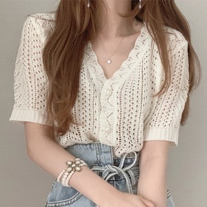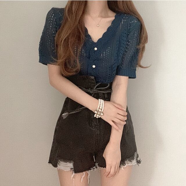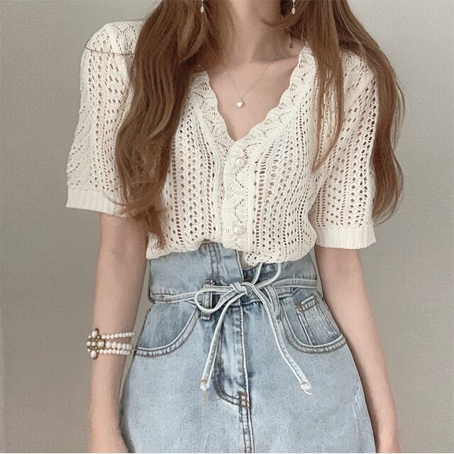 ウエスタンスタイルの中空薄いアイスシルクセーター2020新しい女性の夏のVネック半袖カーディガン薄いエアコン付きシャツトップ 韓国婦人29555878481