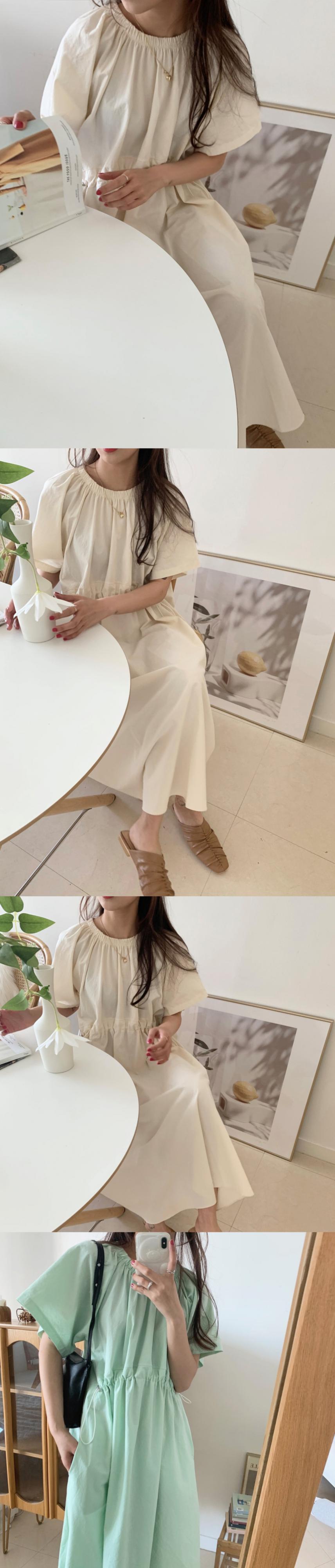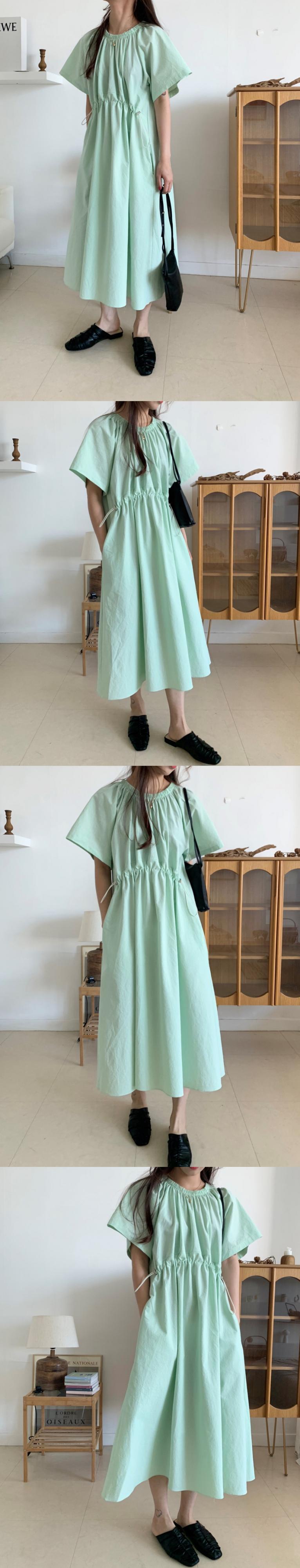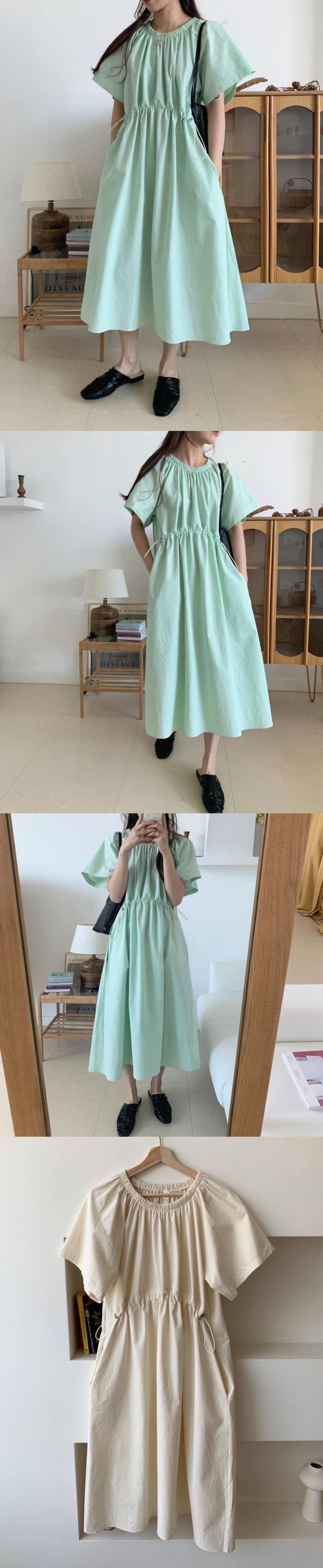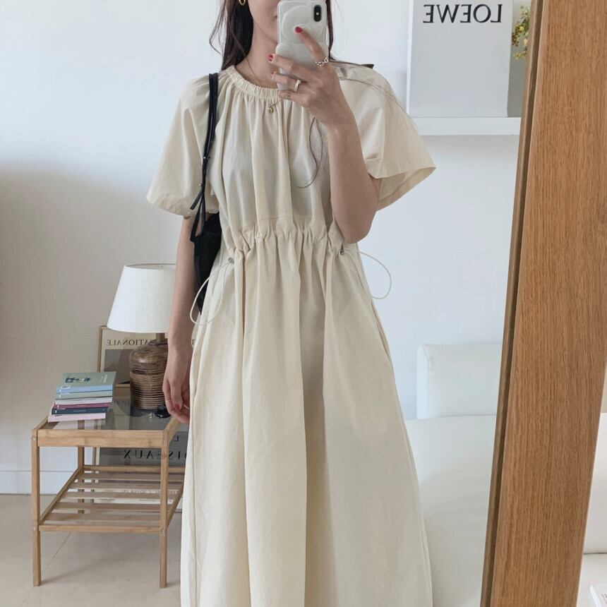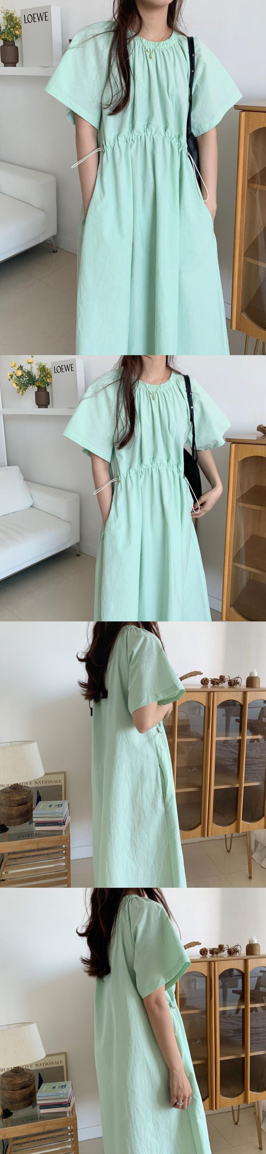 2020年夏の新しいシックなミントグリーンプリーツロングスカート巾着薄手のルーズ半袖ドレス女性 韓国婦人20280903363