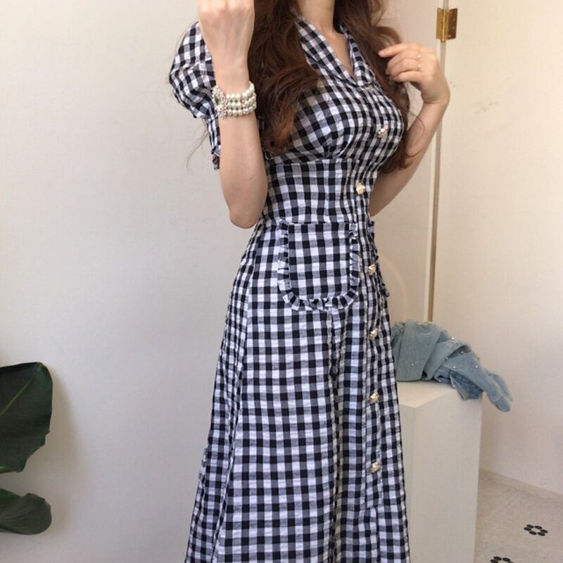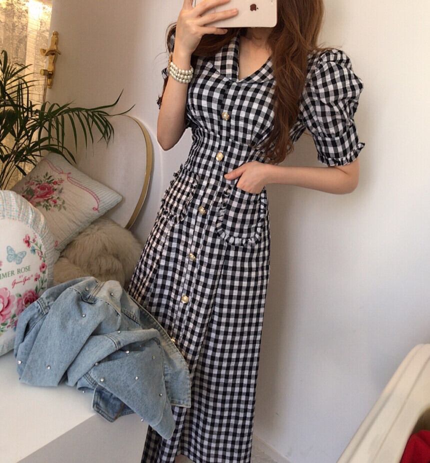 夏の新しい人形の襟木製の耳の格子縞のドレス女性の泡の袖ハイウエストaラインスカートミドル丈 韓国婦人88259865674