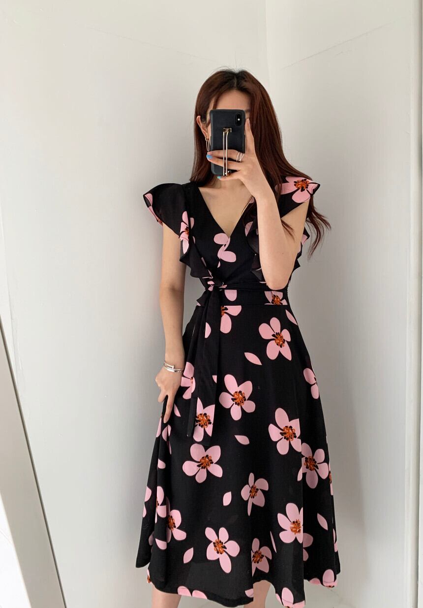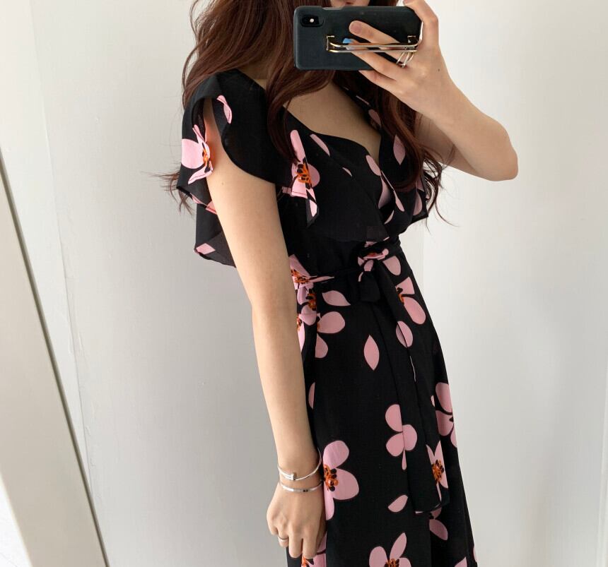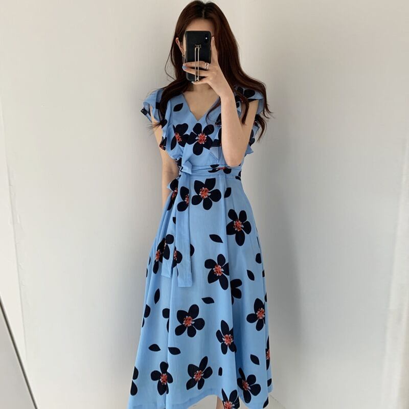 プリントされた小さなフライングスリーブドレスミッドレングス2020新しい春の女性のウエストと薄い夏の気質フレンチスカート 韓国婦人21677365039